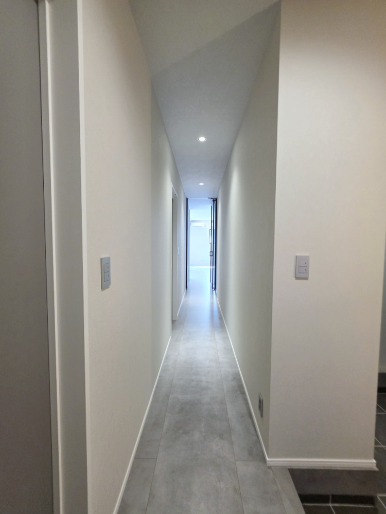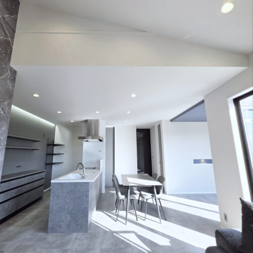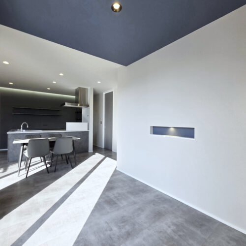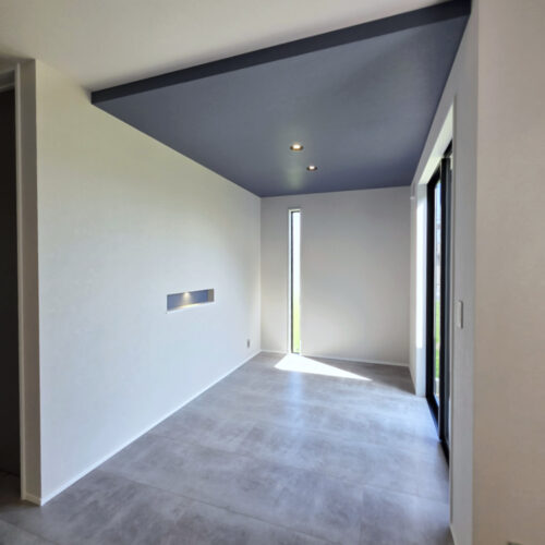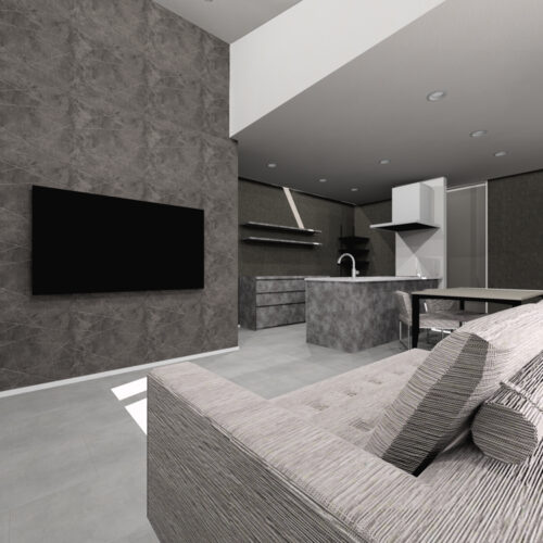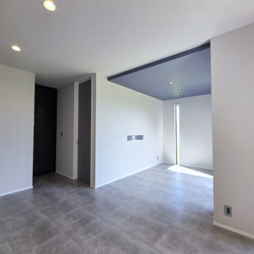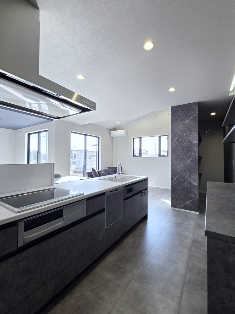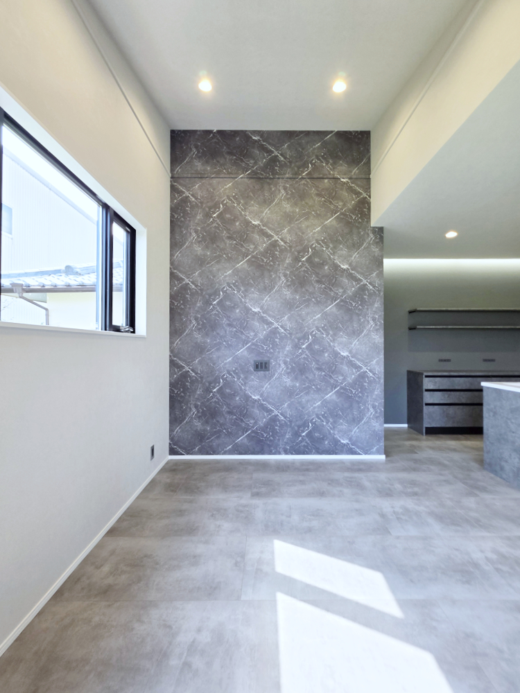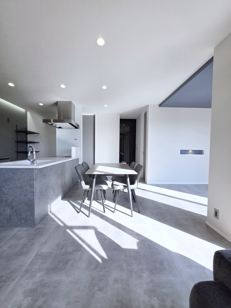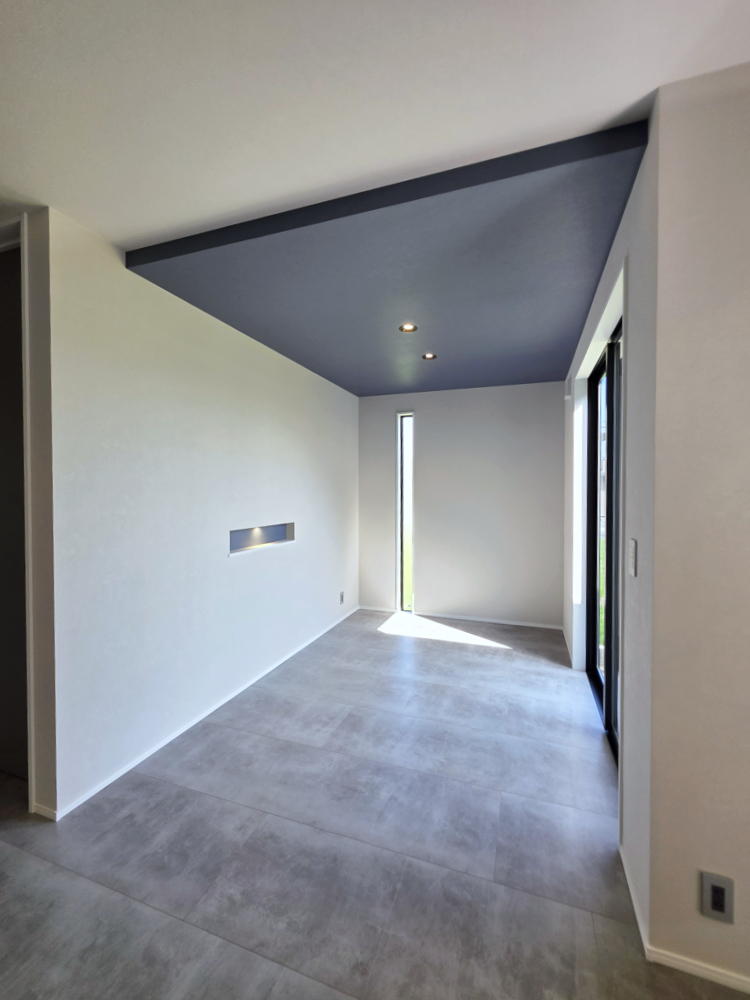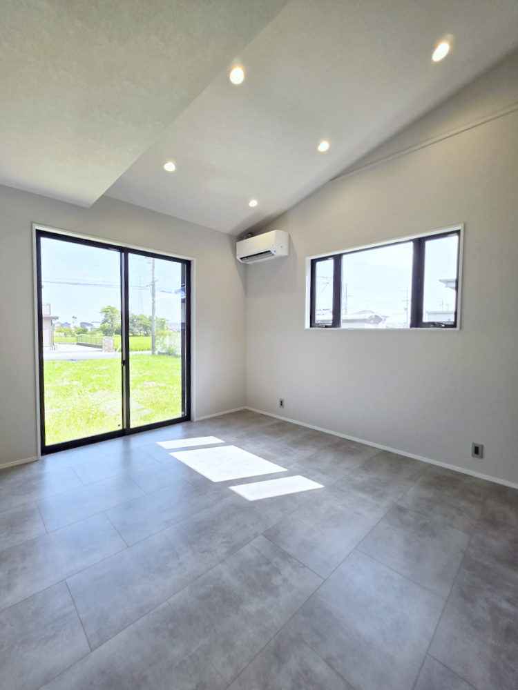 掃き出し窓を背にしたソファ側から広がる勾配天井は開放感があります。ホールとリビングをつなぐブラックガラスファミットのかっこよさや、各所の照明インテリアも注目です!