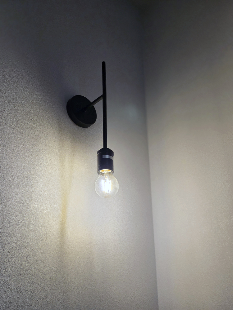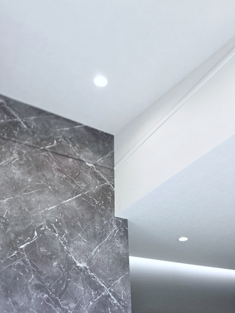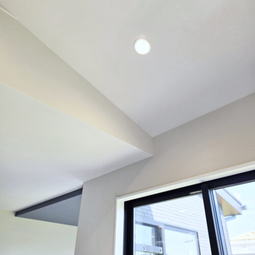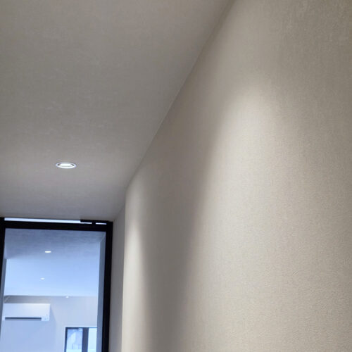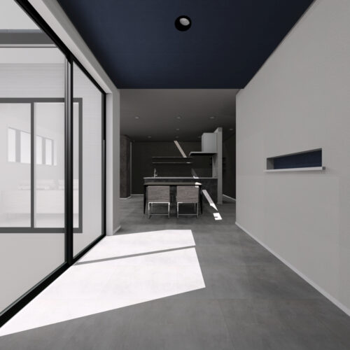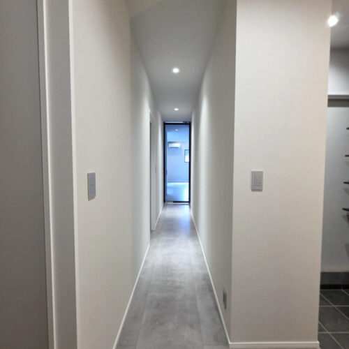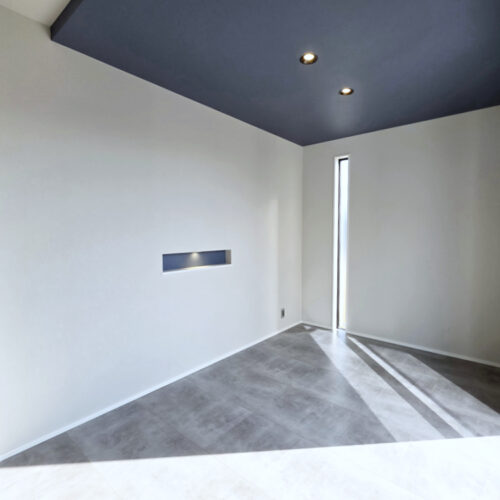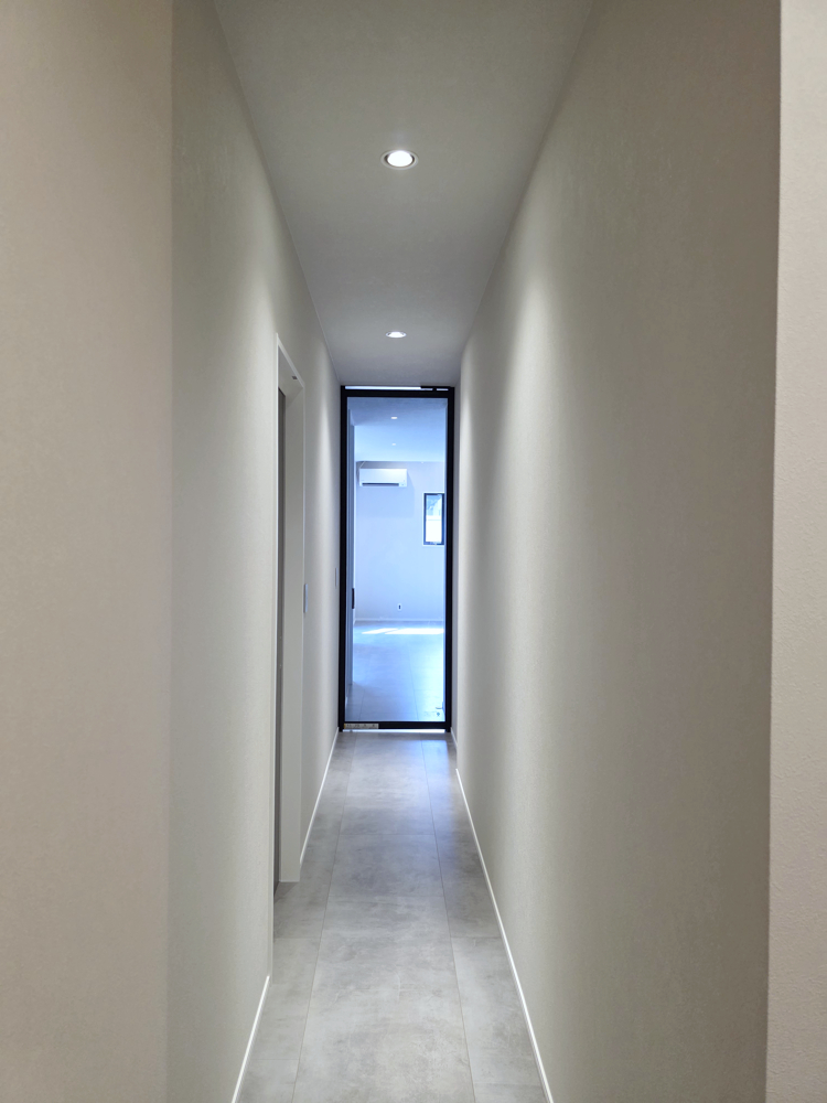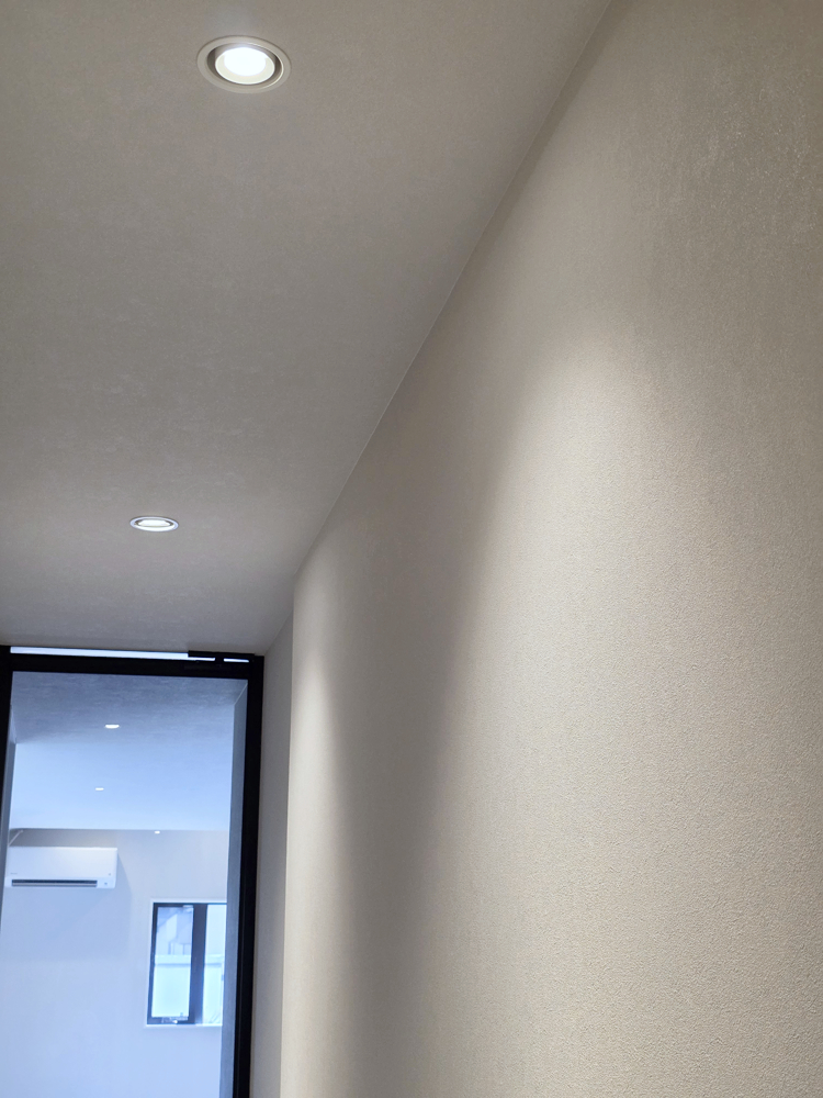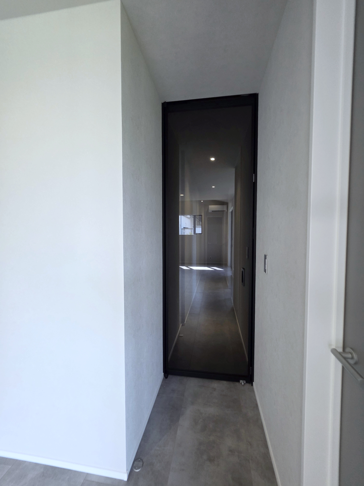 掃き出し窓を背にしたソファ側から広がる勾配天井は開放感があります。ホールとリビングをつなぐブラックガラスファミットのかっこよさや、各所の照明インテリアも注目です!