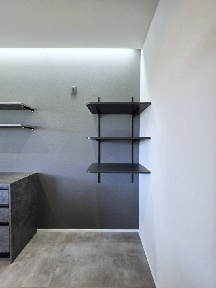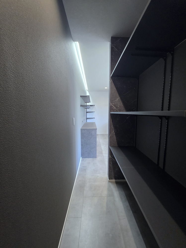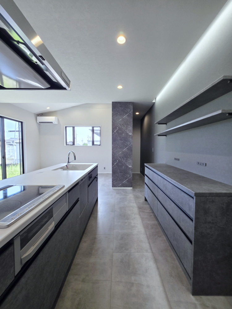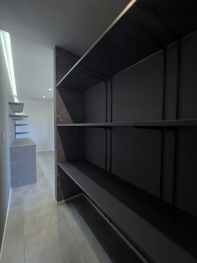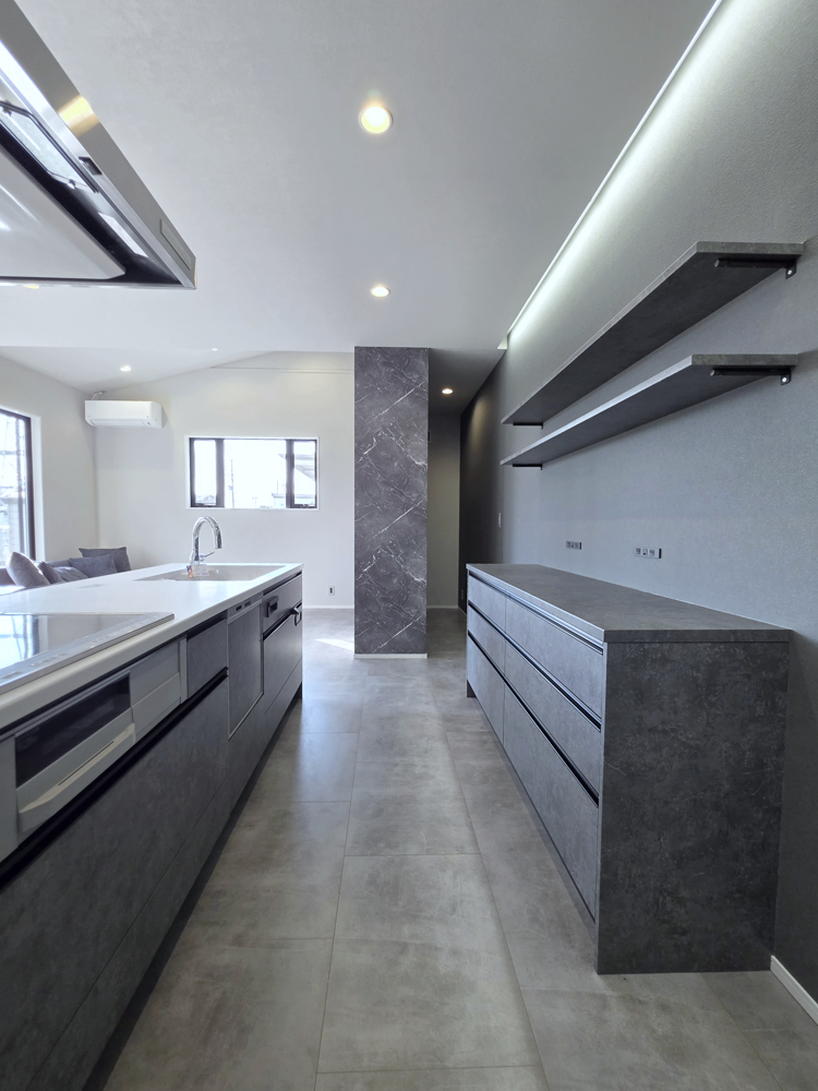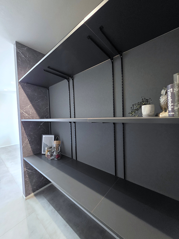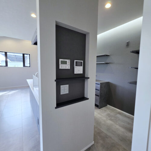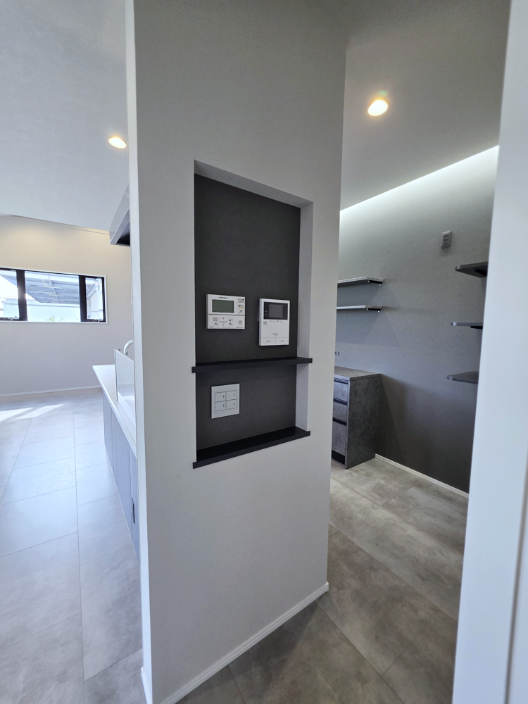 普段は見えないけど、必要な時はすぐに出せる!そんなマルチストレージ。片付けも映えも意識できる!気持ちいいキッチンになりそうな背面収納空間!冷凍庫を置けたり、スイッチ類をニッチに集約させたり、コンセントの場所などにも注目してほしいです。