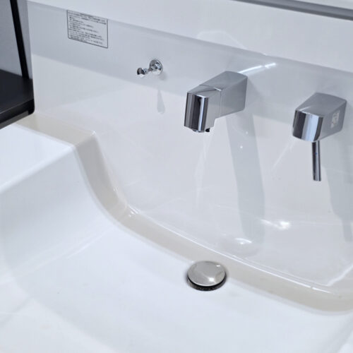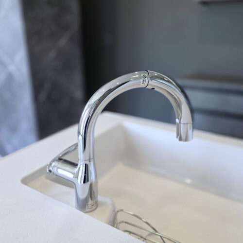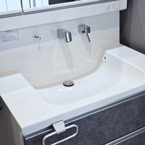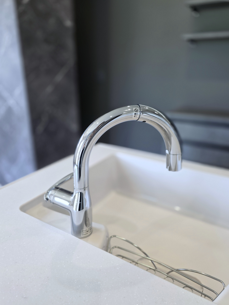 エリシオは、天然石のような美しい質感が特徴。広いカウンターにたっぷりの収納スペースがあり、水栓もスタイリッシュで使い勝手も良い。汚れがつきにくくお手入れも簡単です。