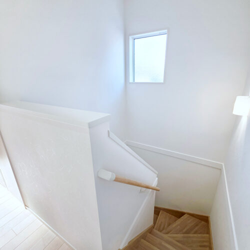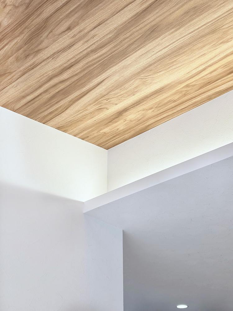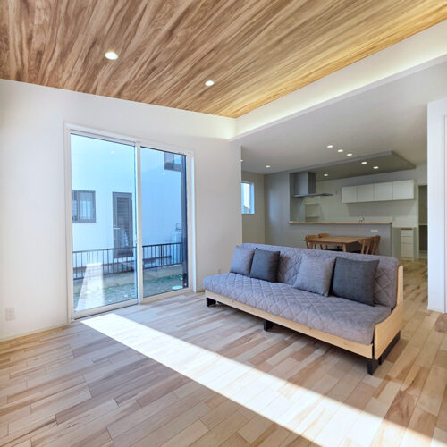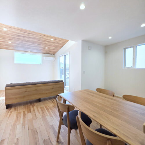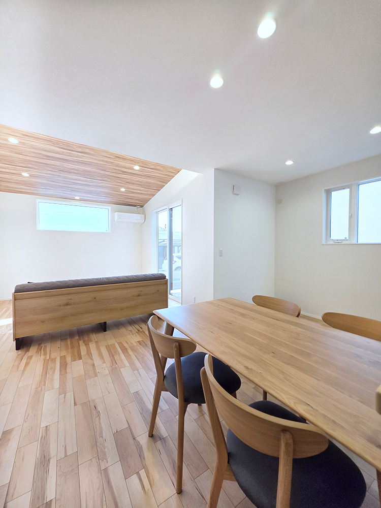 リビング上部には勾配天井+間接照明を採用し、デザイン性を持たせました。窓をH2200ハイサッシを計画して、南面の光をなるべく取り入れて開放感のあるリビングスペースとなっております。