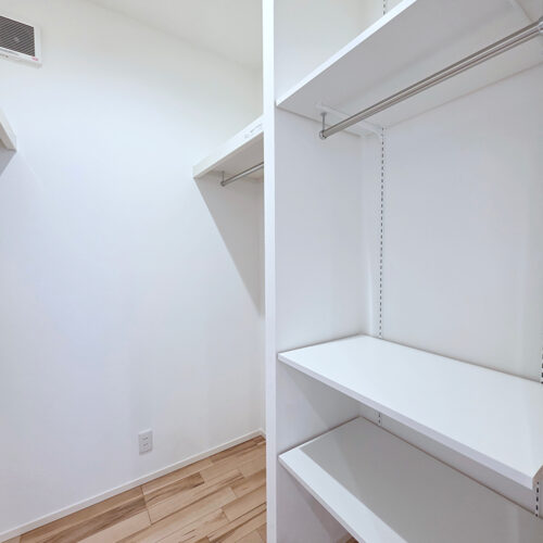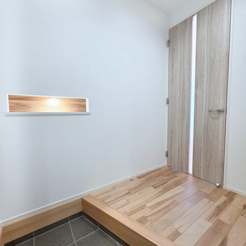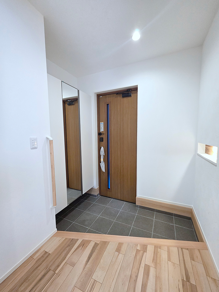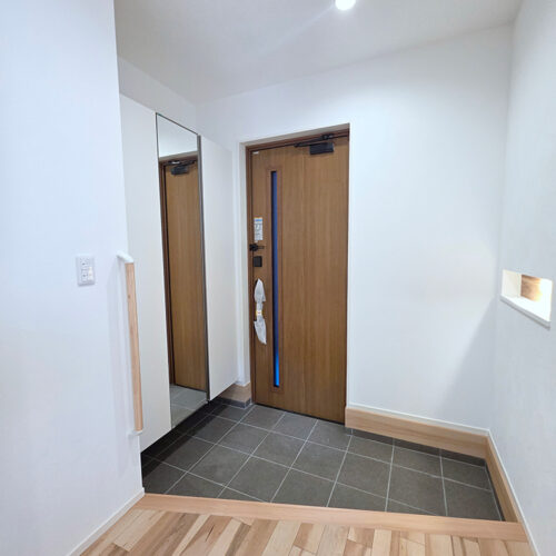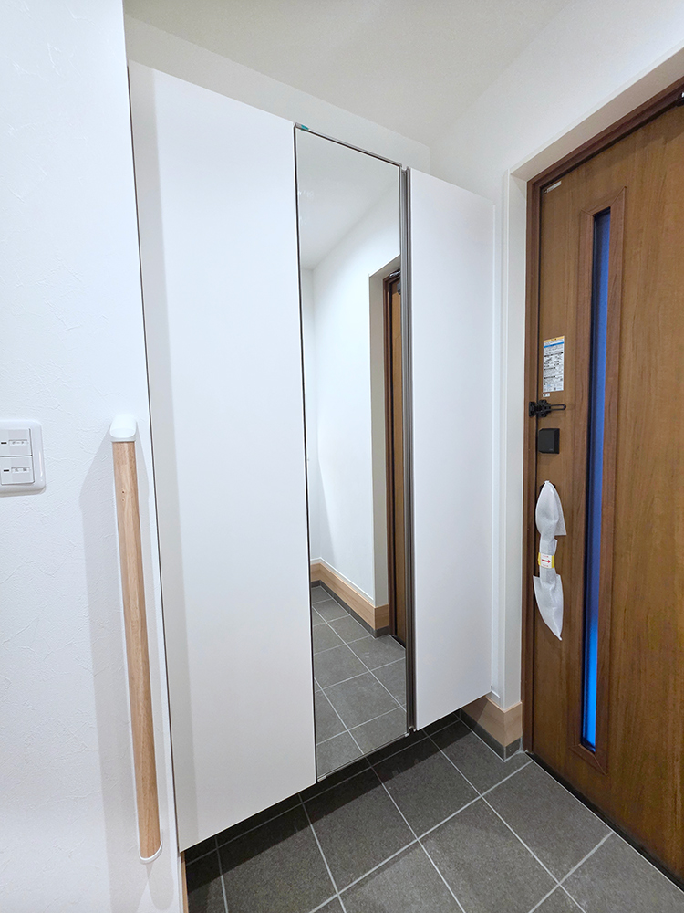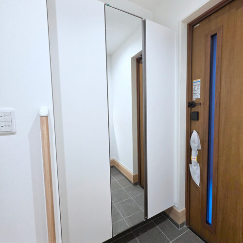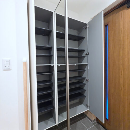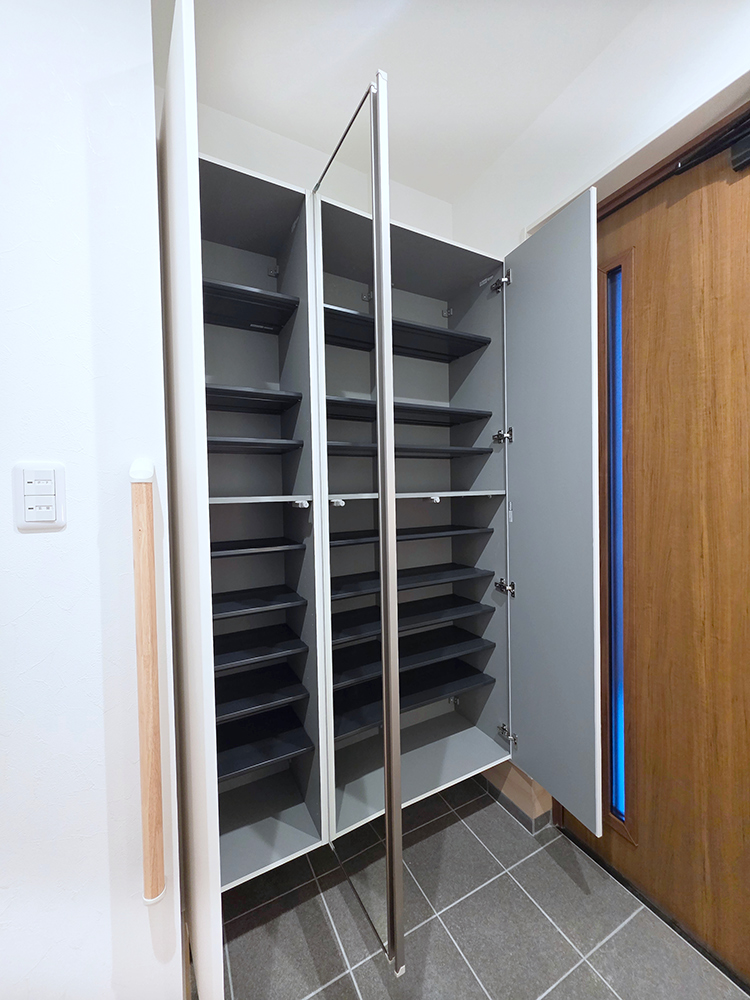 シューズBOXには出勤時に便利な1面鏡を配置し、たっぷりと家族の靴を収納できます。