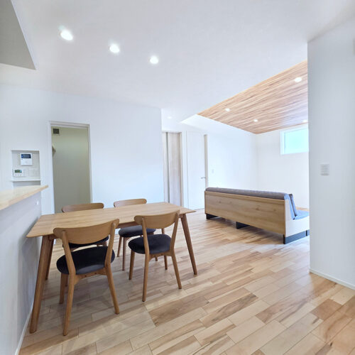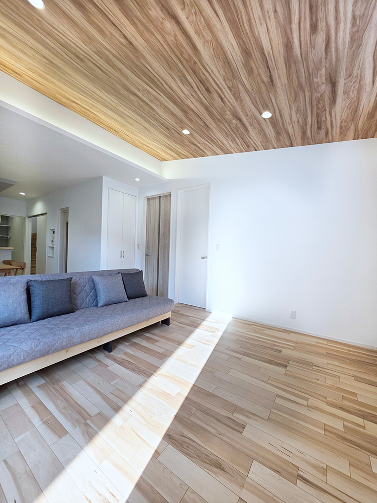 イクタの抗ウイルスフローリング採用。マットな風合いのラスティック塗装に、消臭、ウィルス、抗菌、VOC低減効果をプラスした、安心、安全、健康かつ、天然木ツキ板のフローリングです。