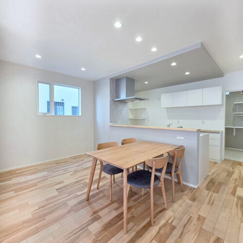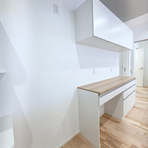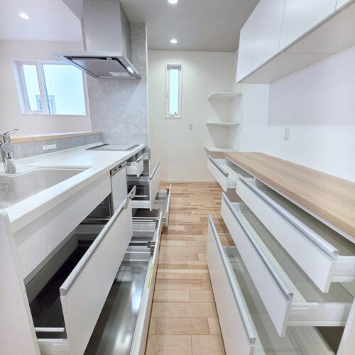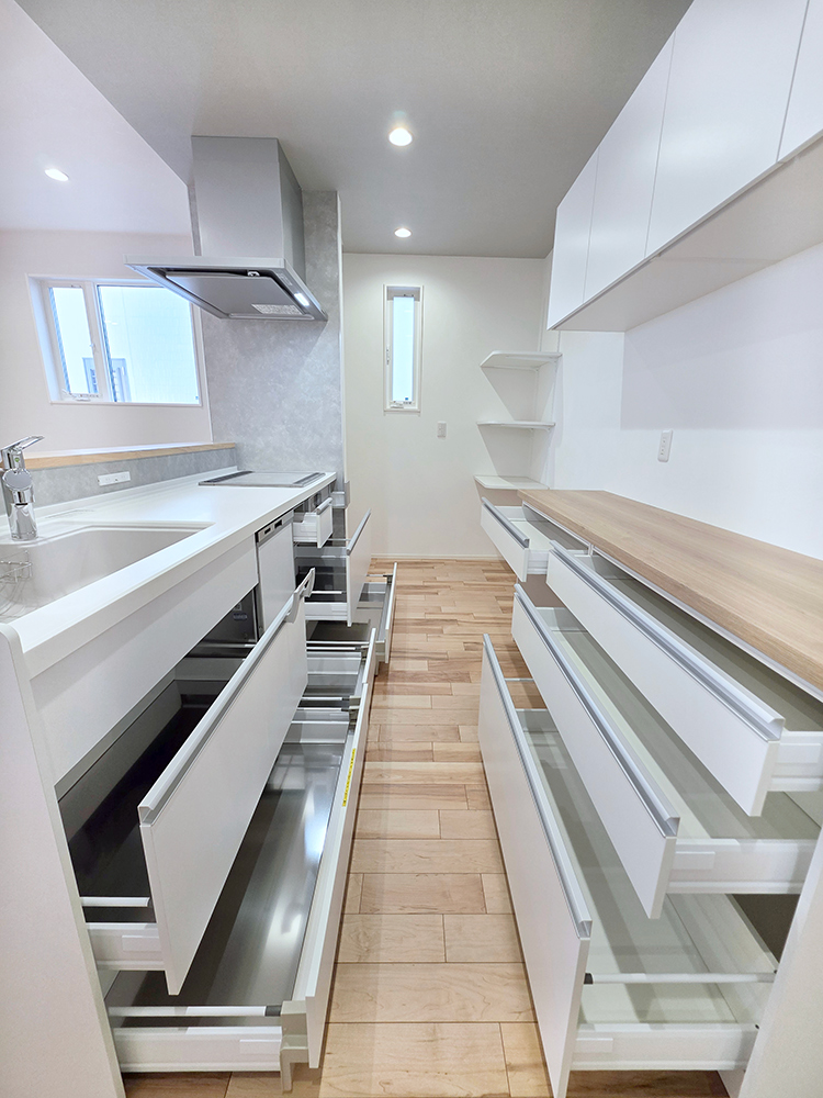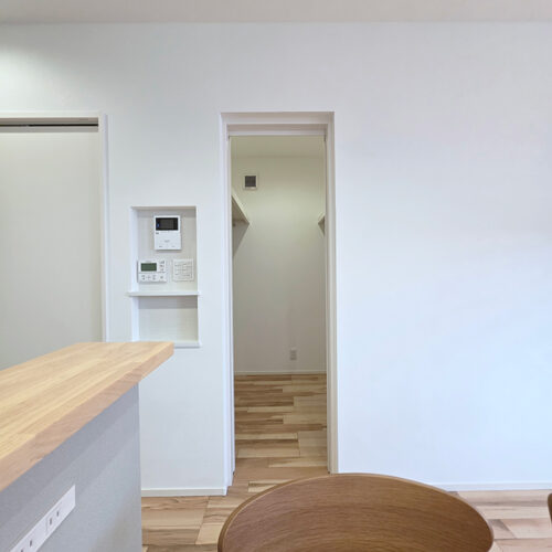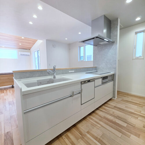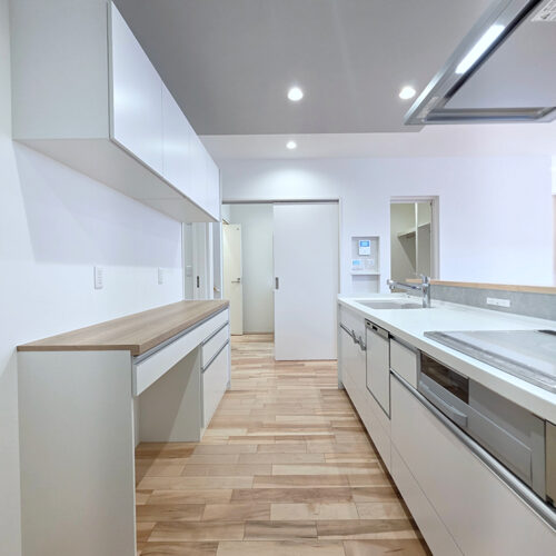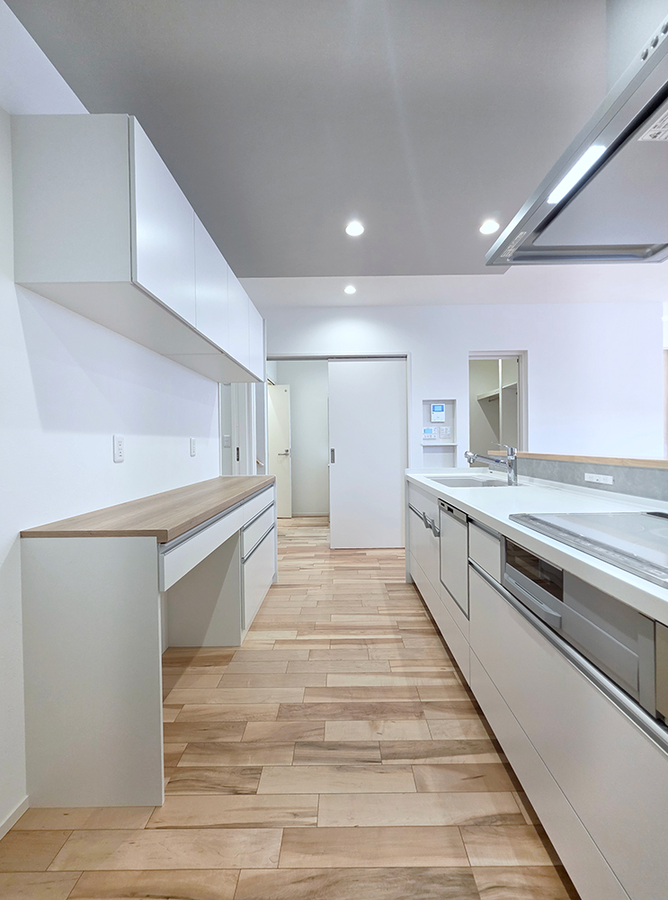 キッチンに立った際に、リビング・ダイニング・カスタヌックで過ごしている家族の様子をうかがえる場所にキッチンを配置しました。キッチン背面にも充分なスペースを確保しています。