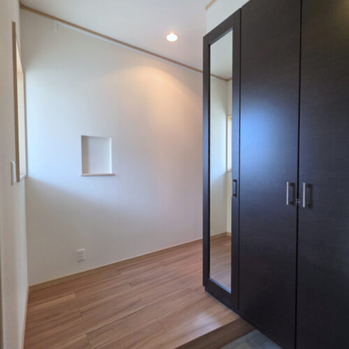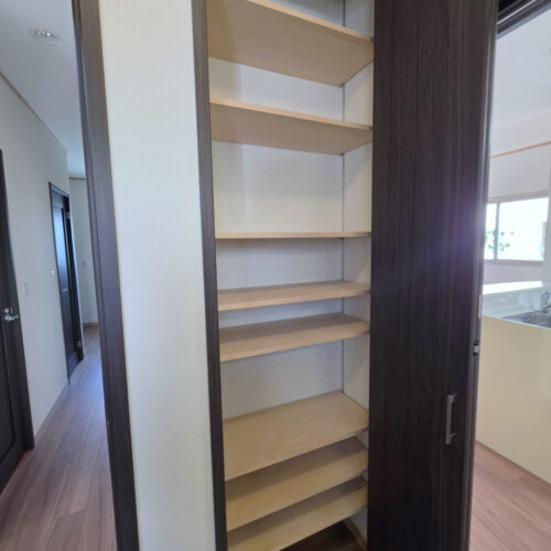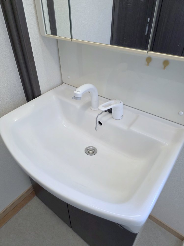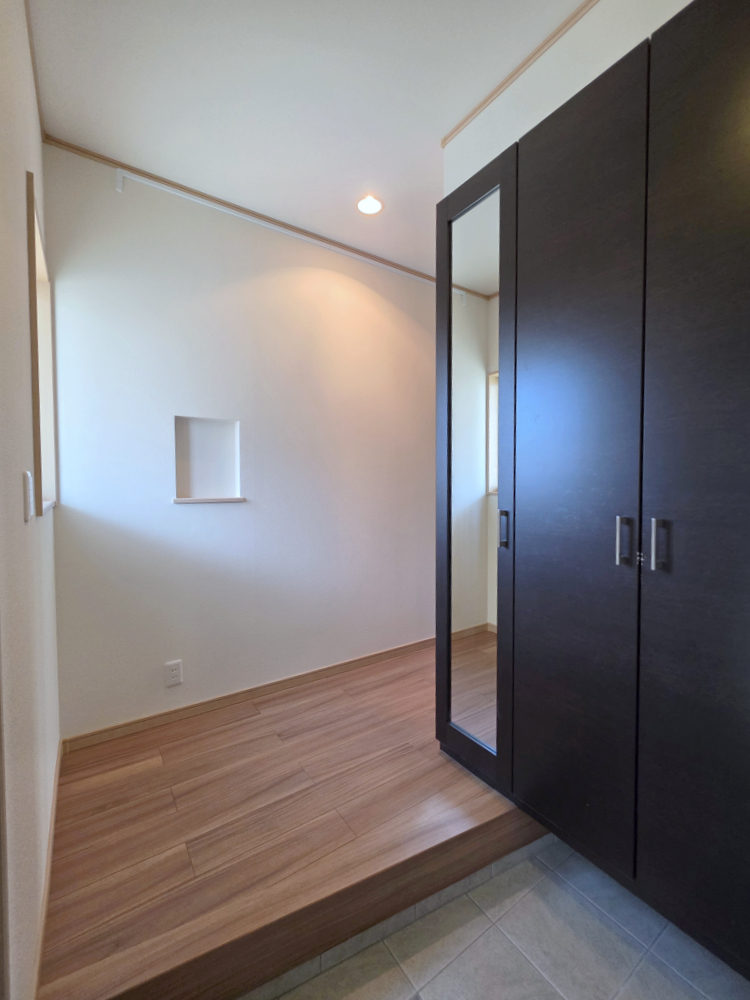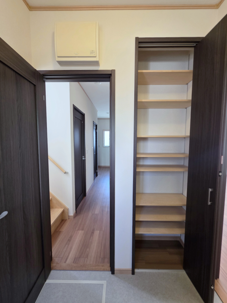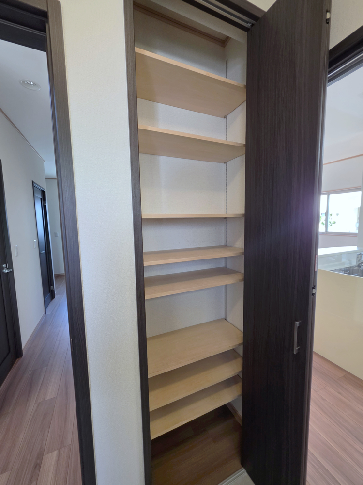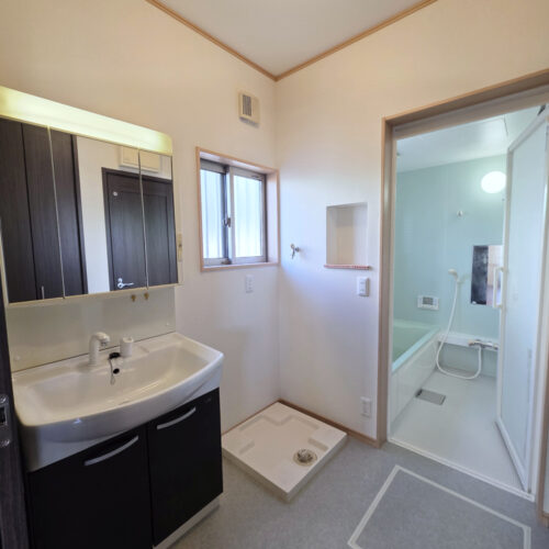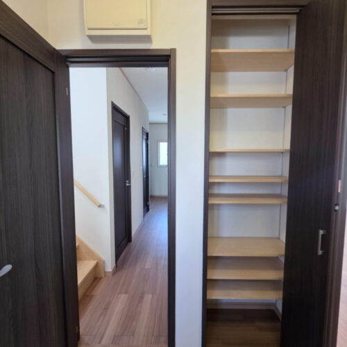 家事ラク動線: ランドリールーム(洗面脱衣所)に収納が備わっており、洗濯・乾燥・収納の流れがスムーズに組めるよう配慮されています。