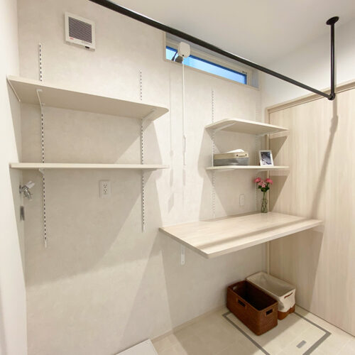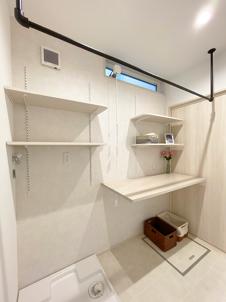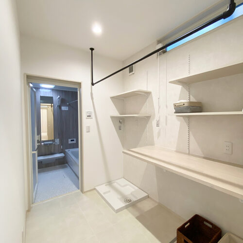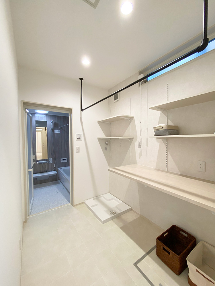 室内物干しの付いた2.5帖の広々ランドリー。