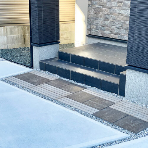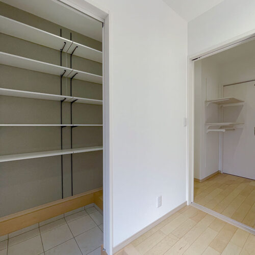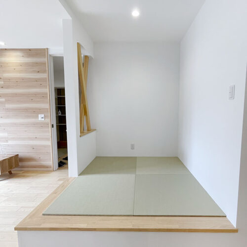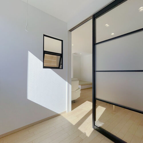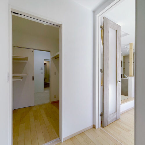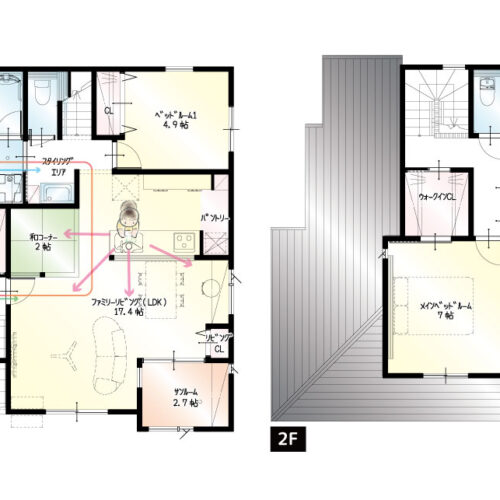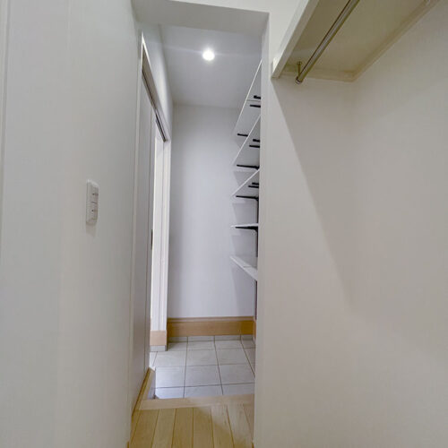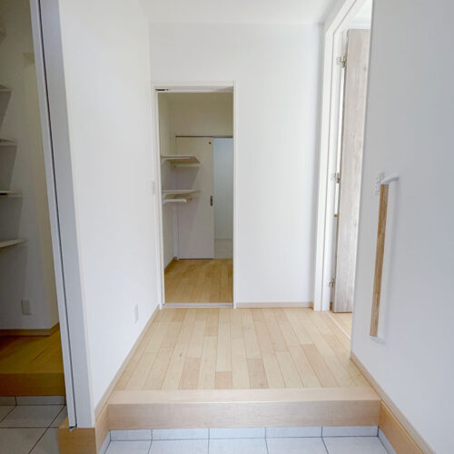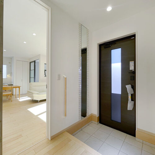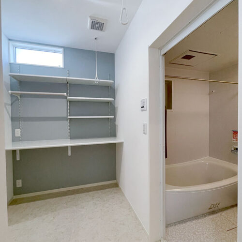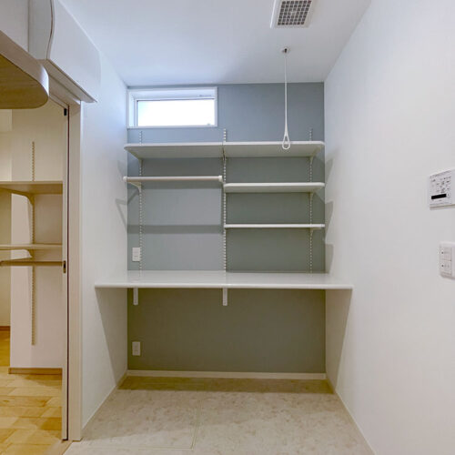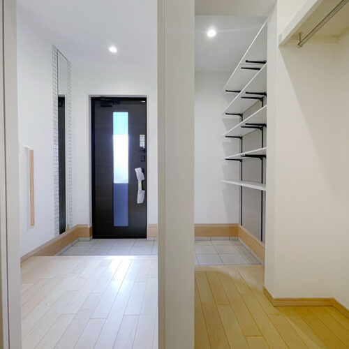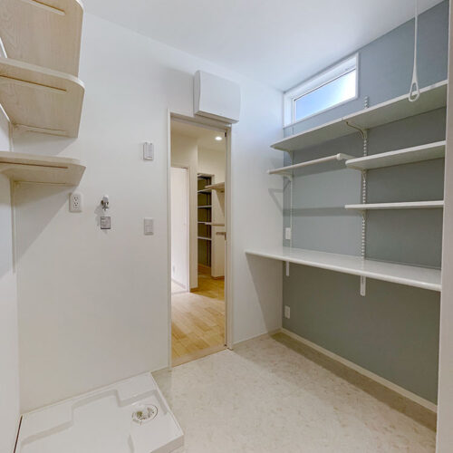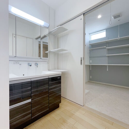 【外構】帰宅してからリビングに入るまでの帰宅の動作を考えた間取り!シューズクローゼットからランドリーまで、直線的に向かっていけます♪1階にはサンルームに加えベッドルームもあり、小さいお子様がいらっしゃるご家庭にも安心の設計となっております!