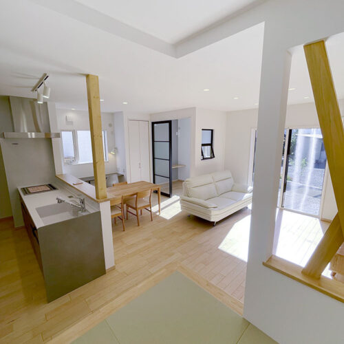 剛床構造は、床に剛性を持たせることで耐震性を高める構造です。地震による床の歪みを最小限に抑え、建物全体の歪みを均等に分散し、建物の倒壊を防ぎます。一般の在来工法に比べて約3倍の剛性があります。