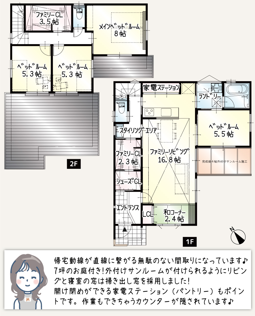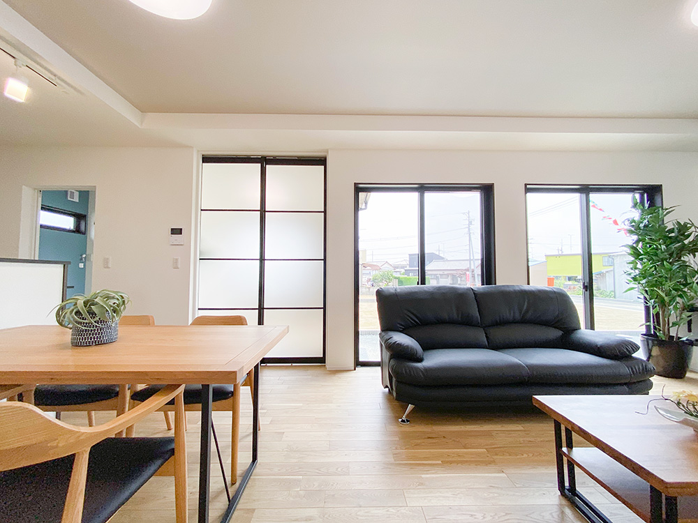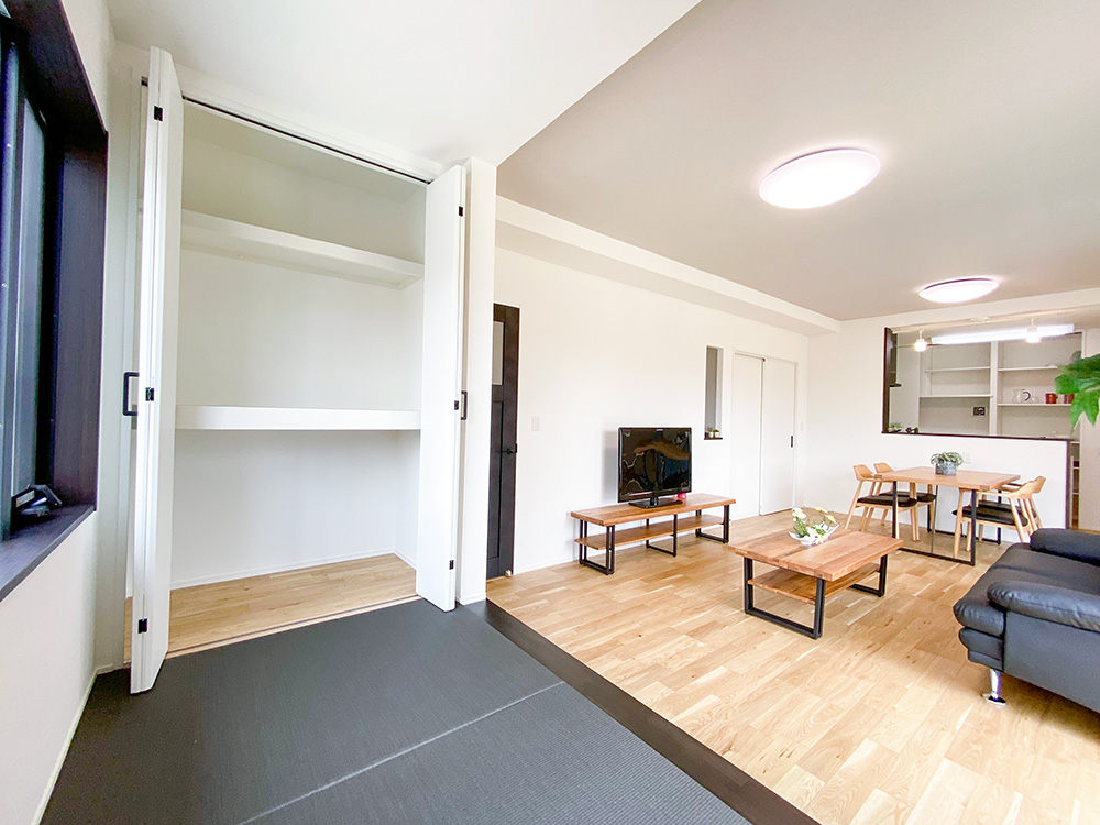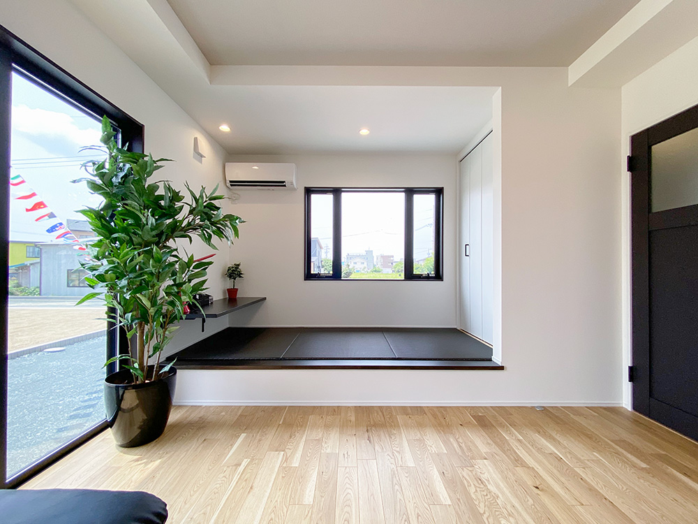 サンルームとウッドデッキ、ちょこっと和コーナーがついた欲張り住宅!1階での生活を充実させたい!という方におすすめの住まいです。敷地が広いので、玄関外で遊べるのも魅力です。