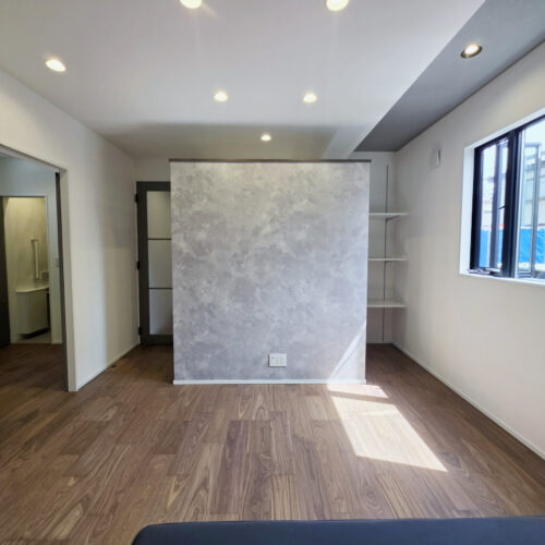 テレビ側には可動棚とハンガーパイプを設置。隠しつつも空間を広げる工夫は要チェックです。