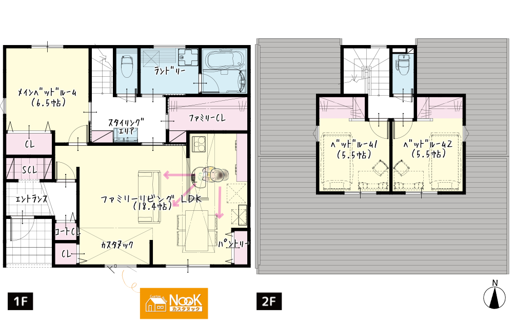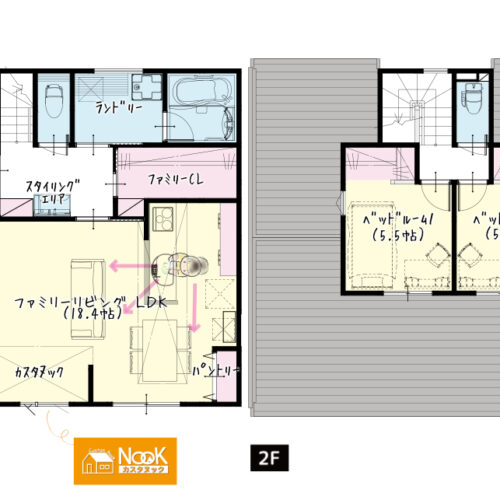 ファミリーCL と ランドリー、浴室 が近くに配置されており、洗濯・乾燥・収納の家事動線が非常にスムーズです。