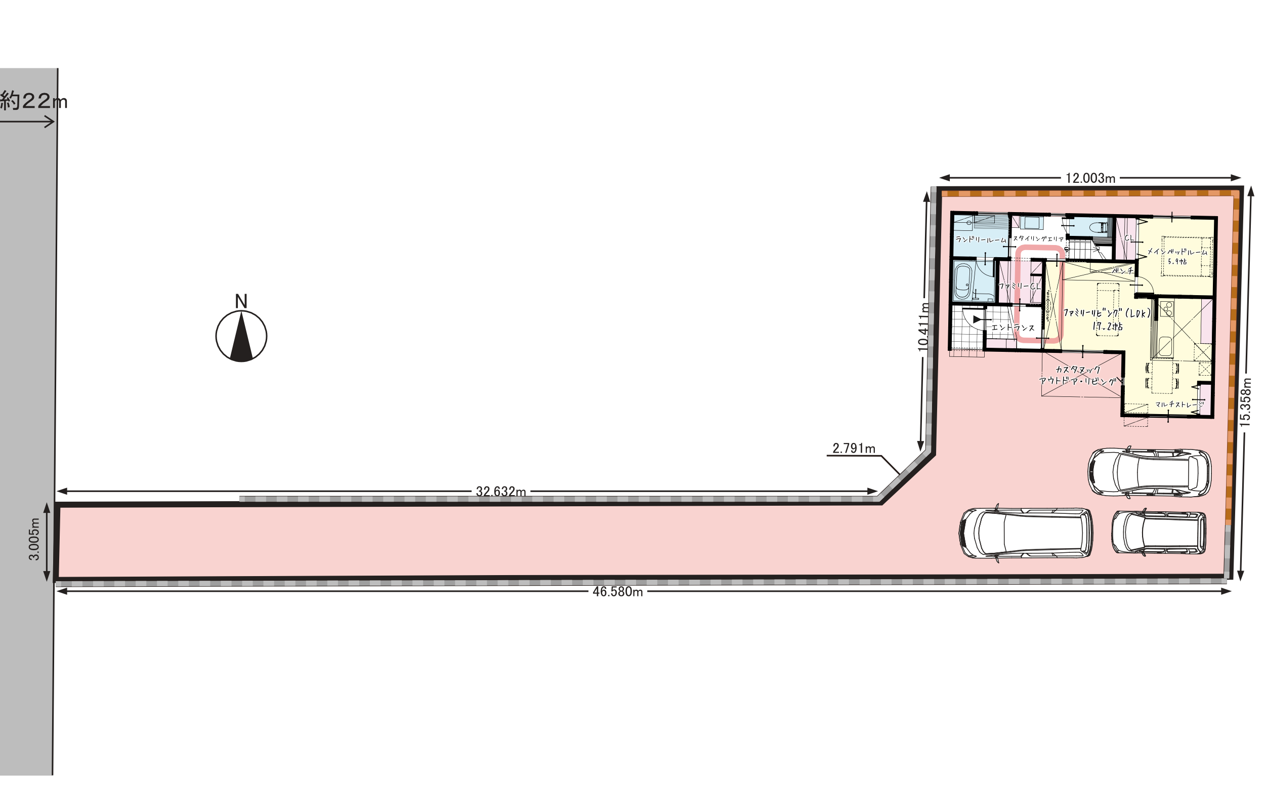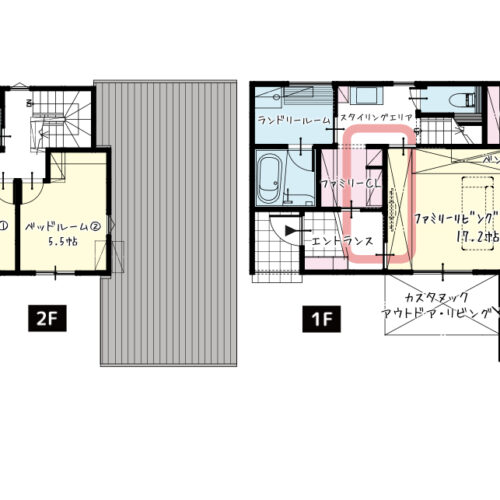 ・エントランスからは2way動線!①ファミリーCLから水回りに向かう帰宅動線②リビングに向かうゲスト動線を設けました。