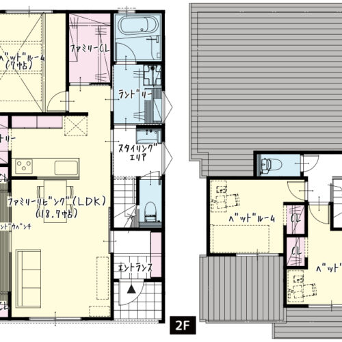 水回りが一直線に配置され、家事効率が非常に高いのが特徴です。 ランドリーからファミリーCLまですぐ隣で、洗う→干す→収納するが最短距離で完結。