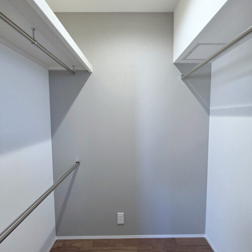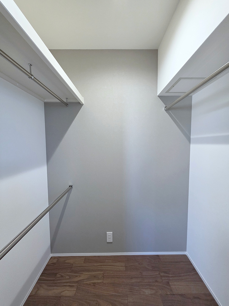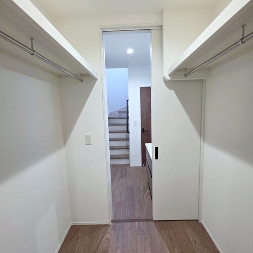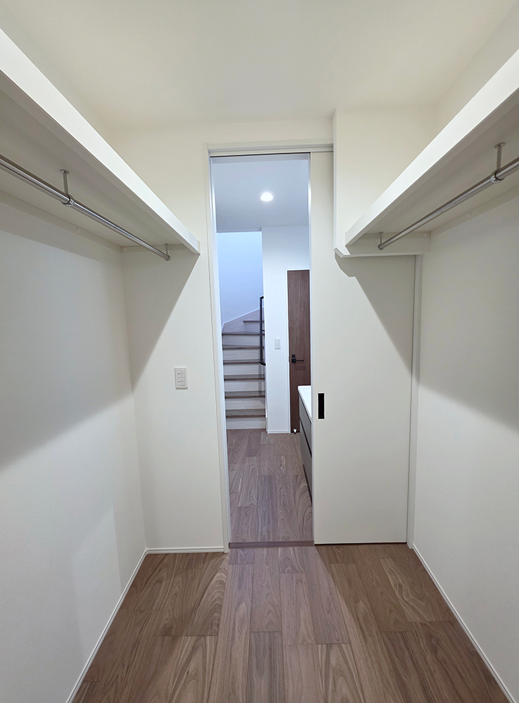 ファミリークローゼット(ファミリーCL)があり、家族全員の衣類や小物をまとめて収納でき、LDKが散らかりにくいです。