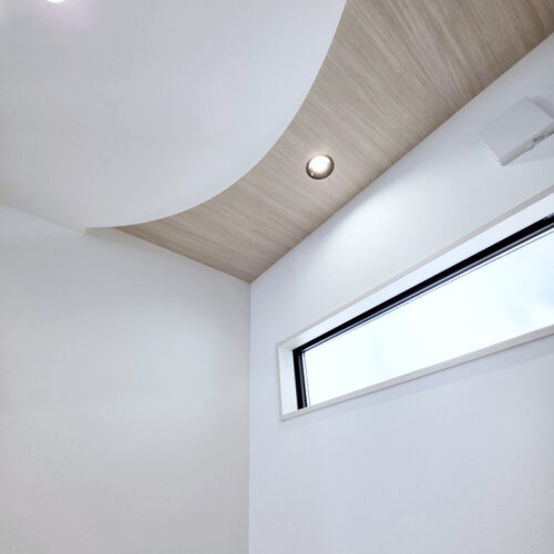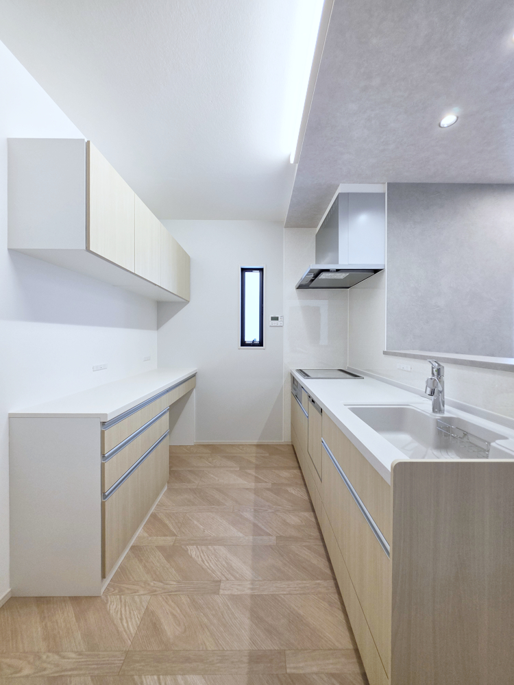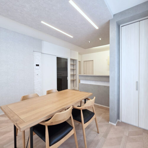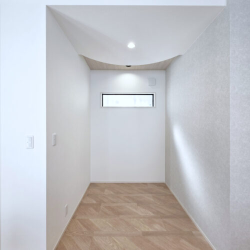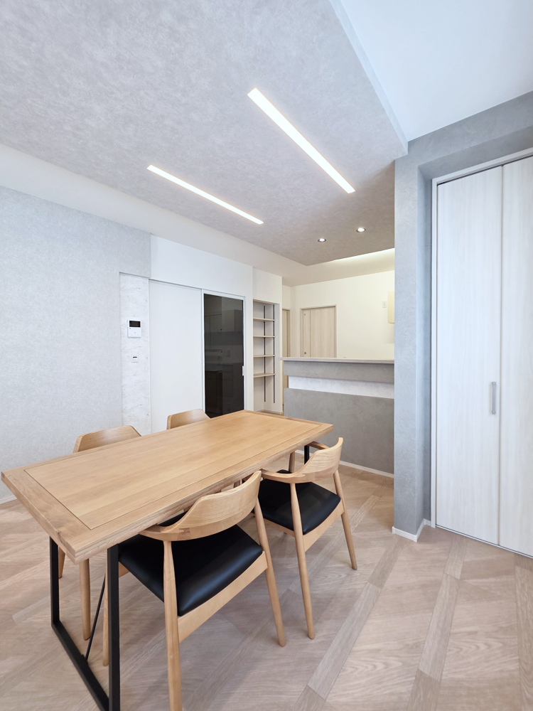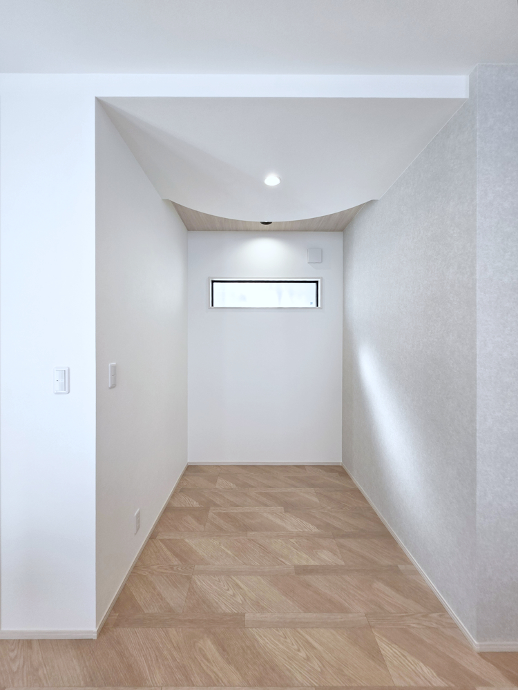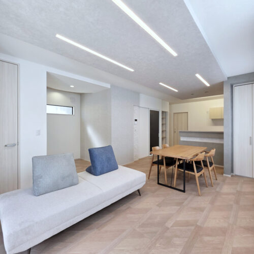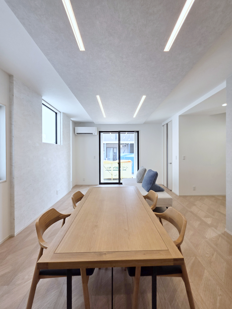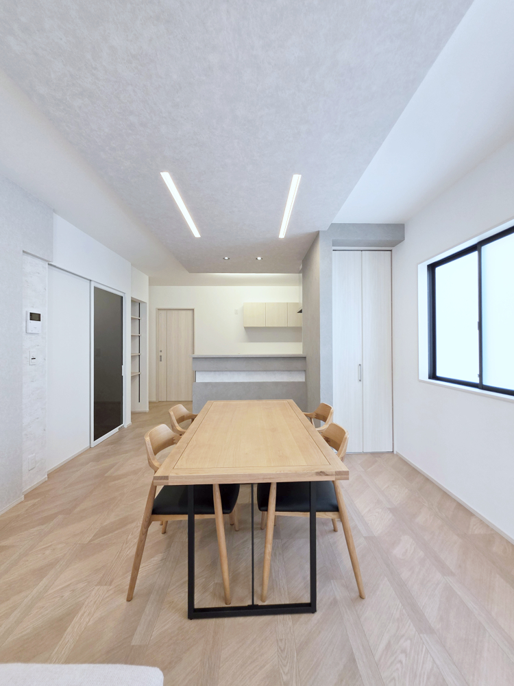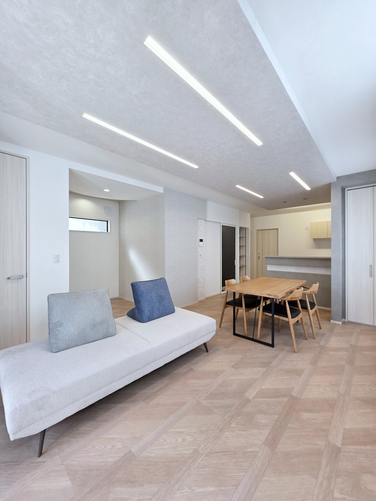 東洋テックスの抗ウイルスフローリング採用。横溝加工することで、1枚板を縦継ぎした天然木に見えるような仕上がりを実現。