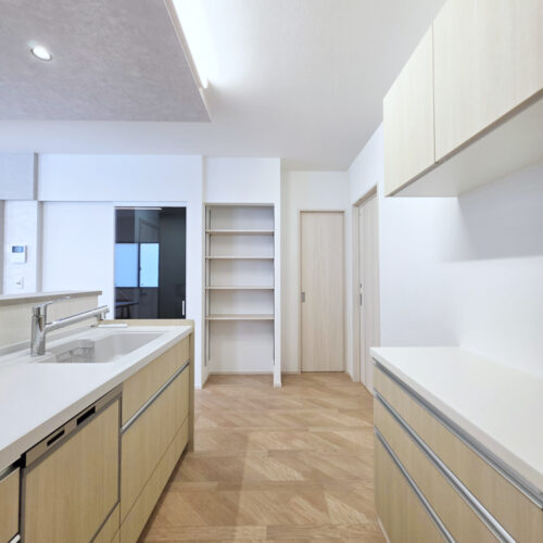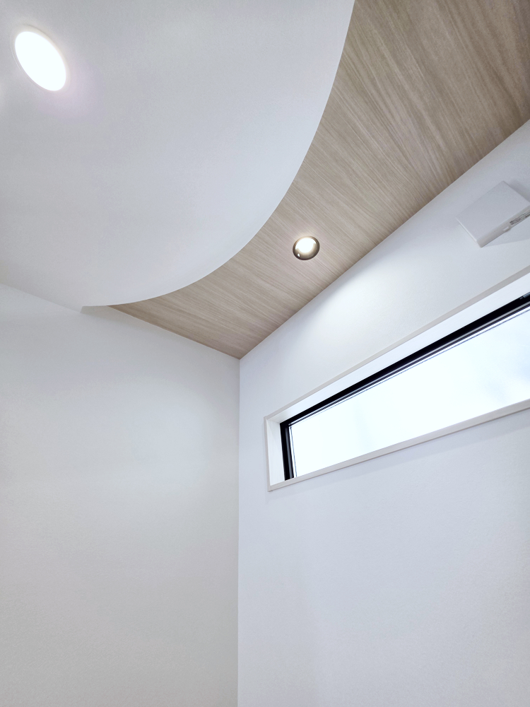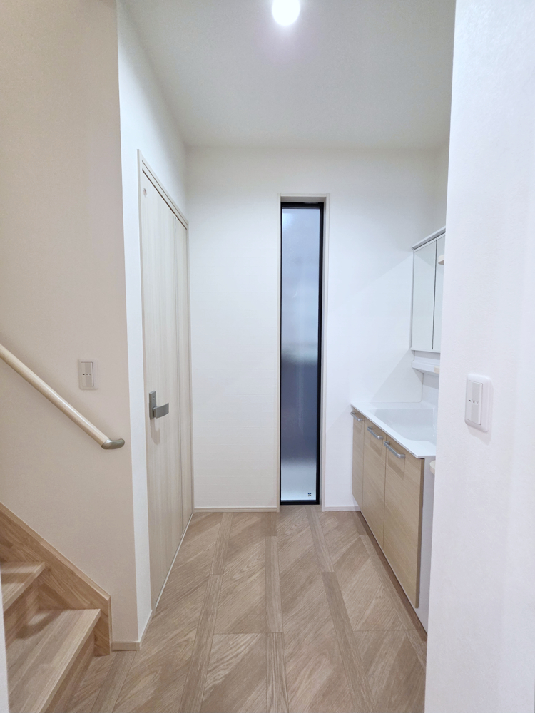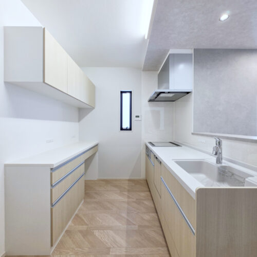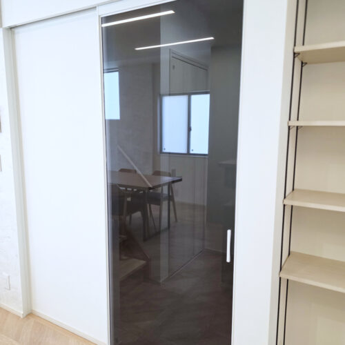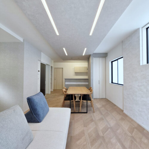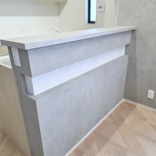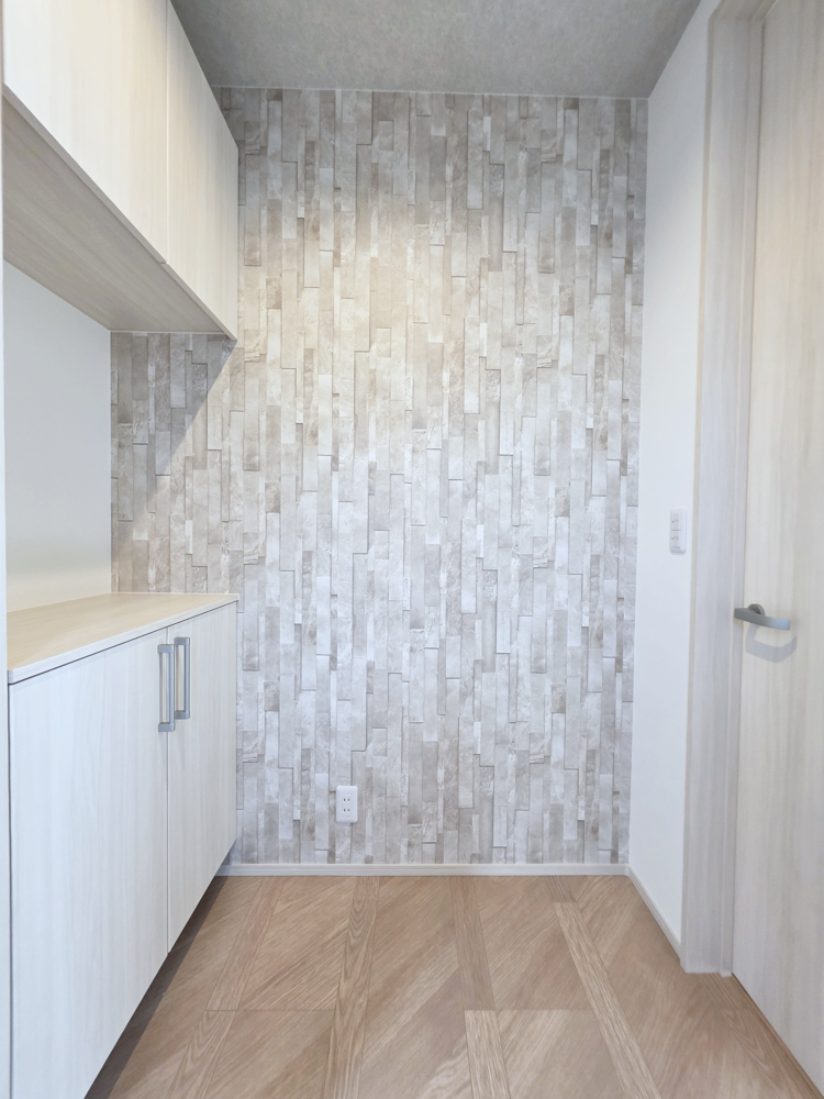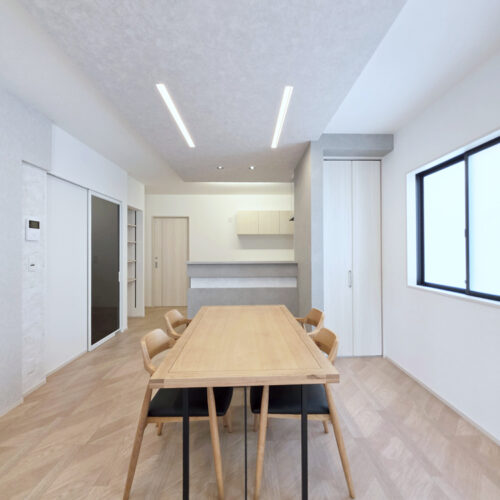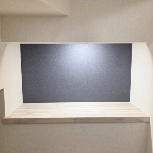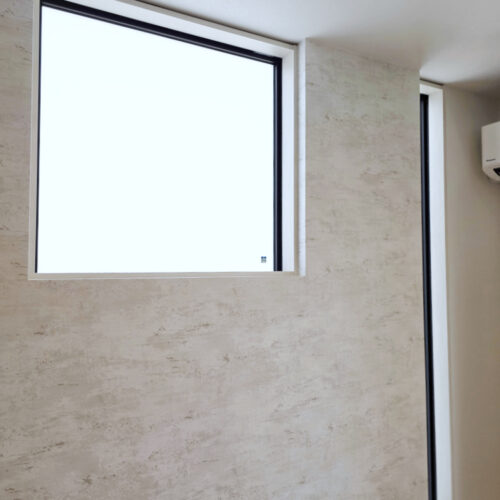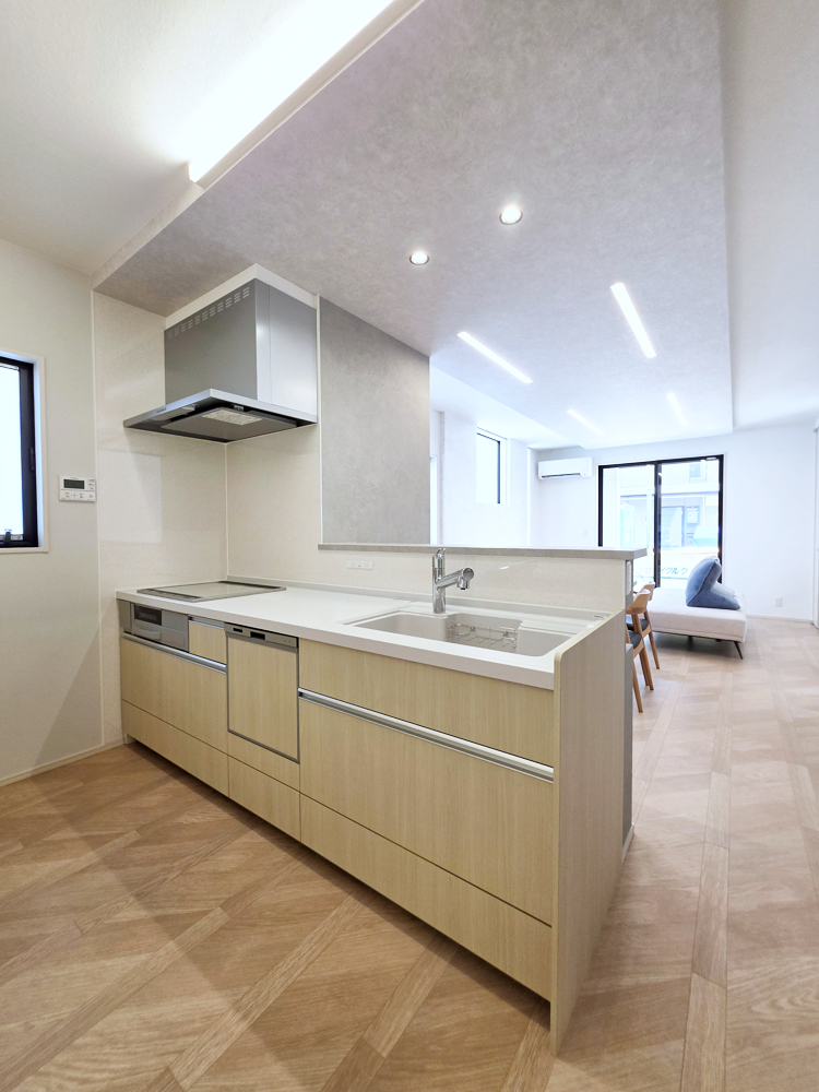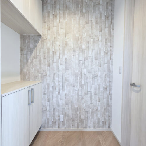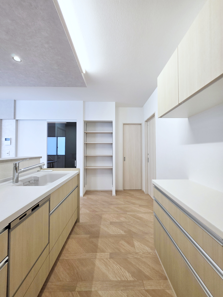 東洋テックスの抗ウイルスフローリング採用。横溝加工することで、1枚板を縦継ぎした天然木に見えるような仕上がりを実現。