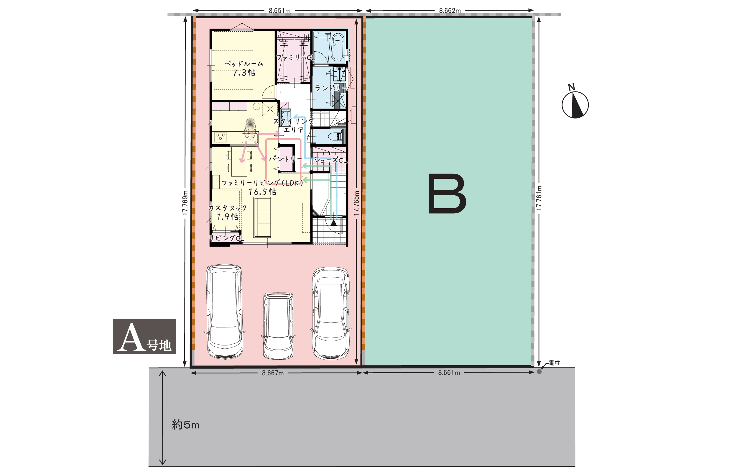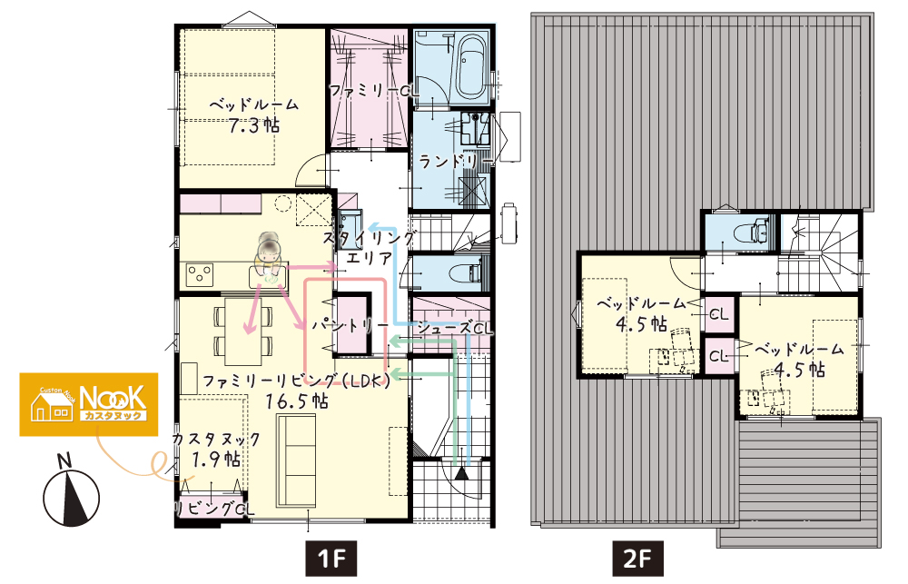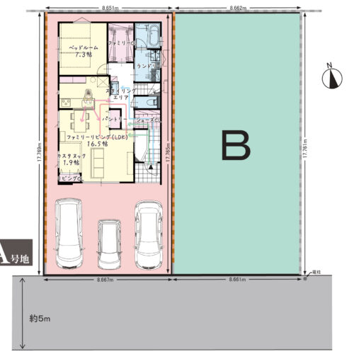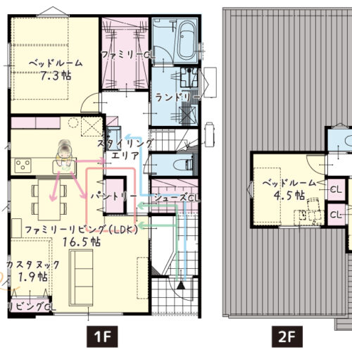 【長期優良住宅】駐車3台可能!玄関からランドリー・ファミリークローゼットへとつながる回遊動線がある家事ラクな住まい!リビング横のカスタヌックが家族の距離をやさしく繋ぐ1階完結型の3LDK。