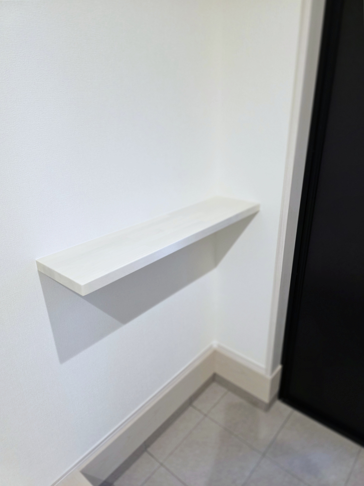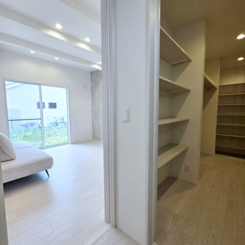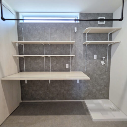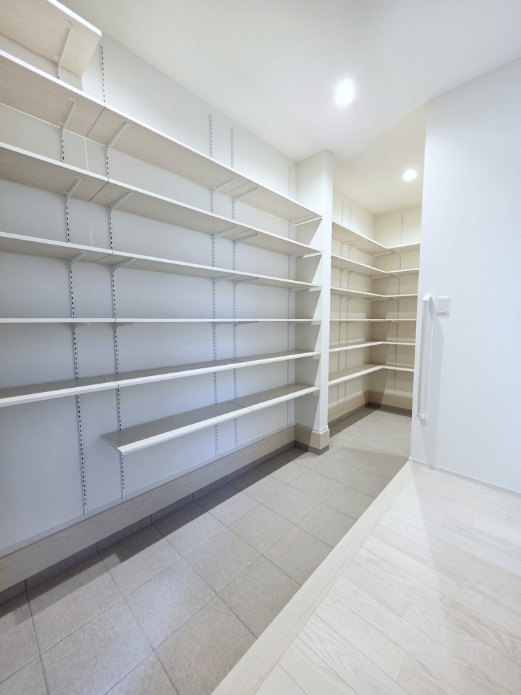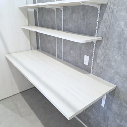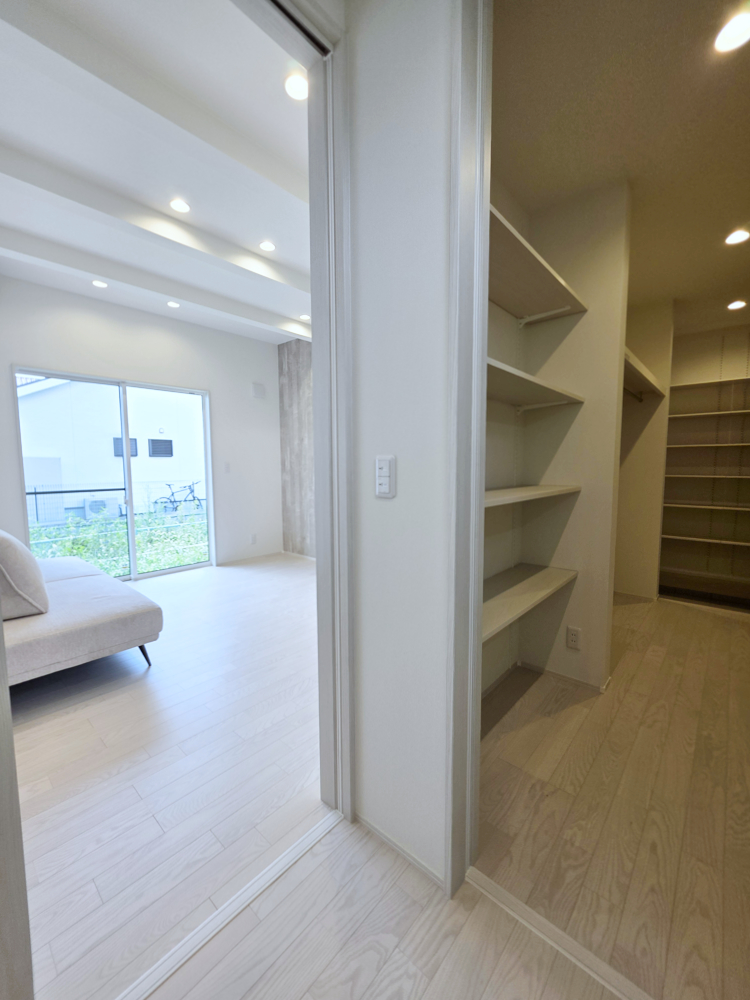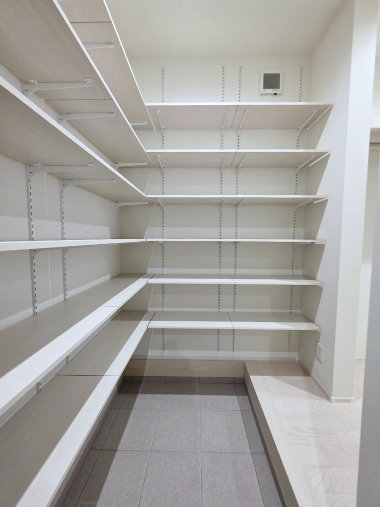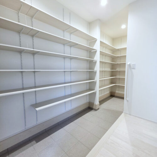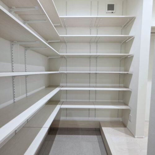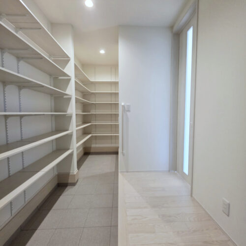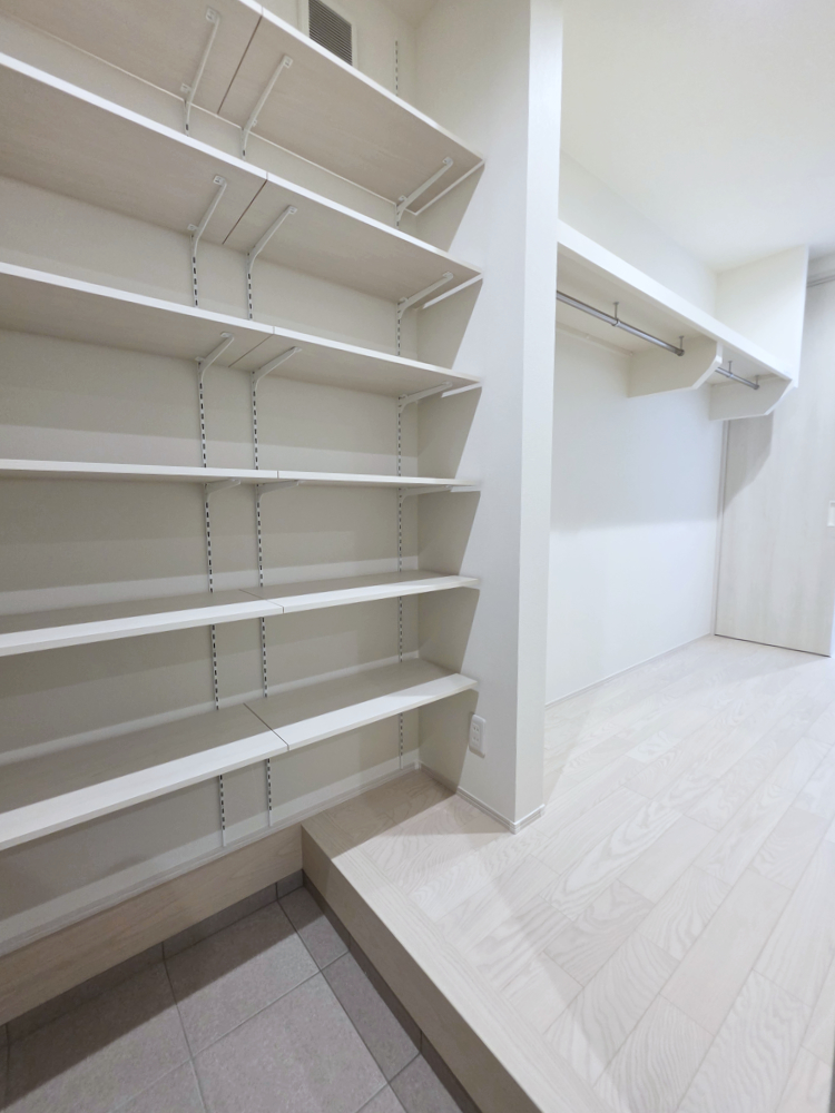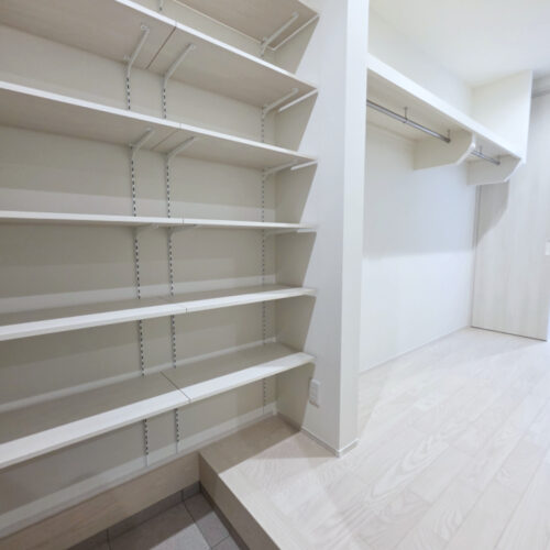 エントランスには、2.6m(3分割)の棚が6段ありたっぷり収納できます。