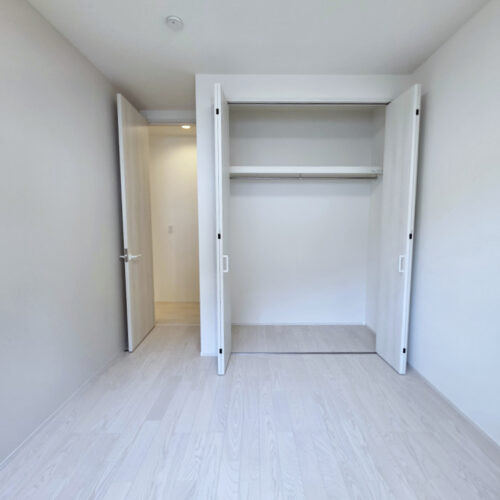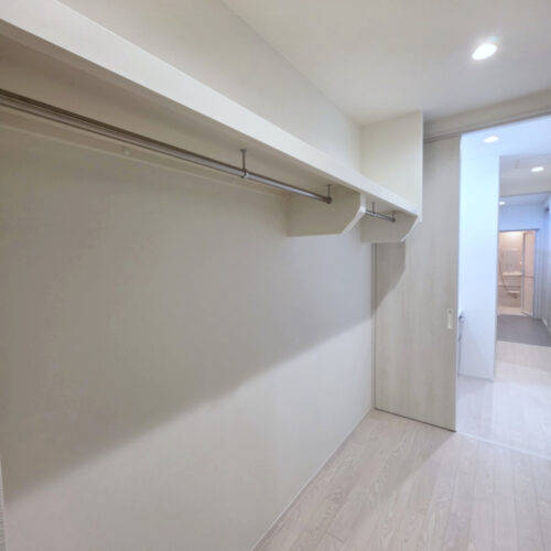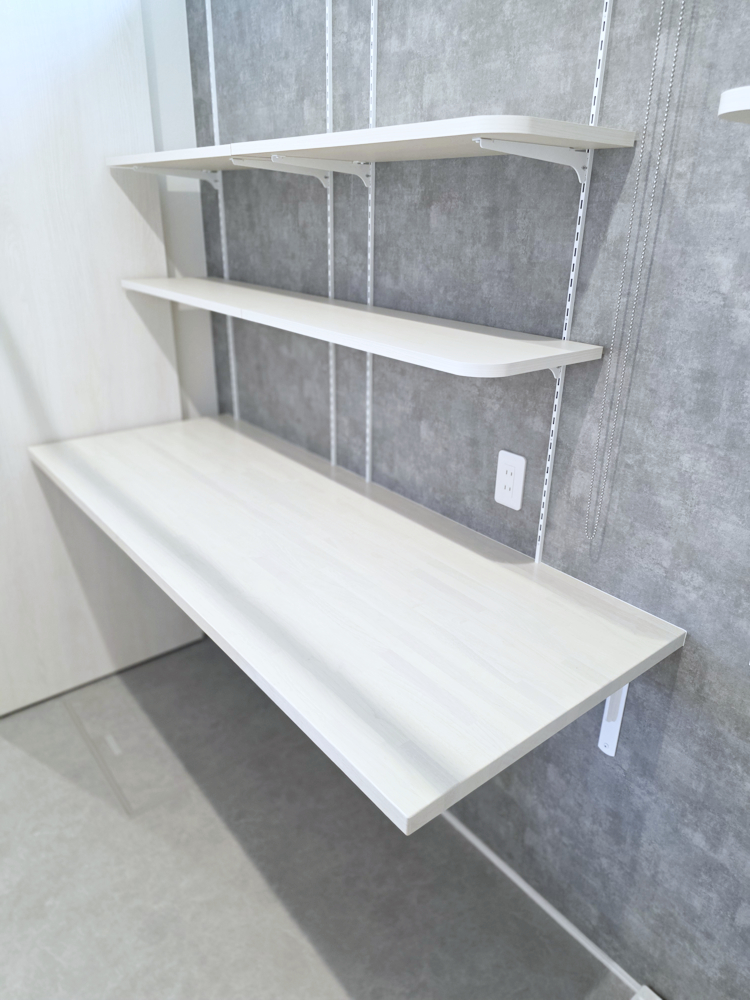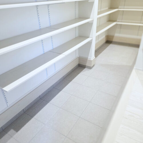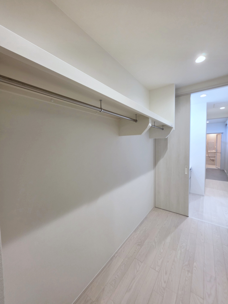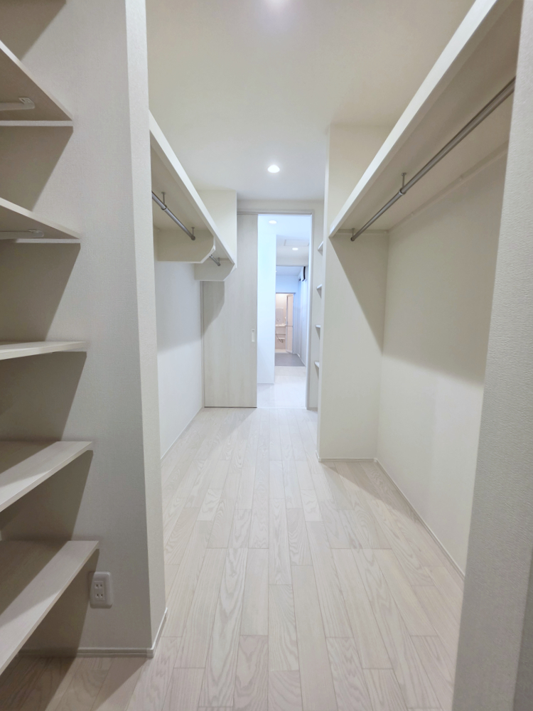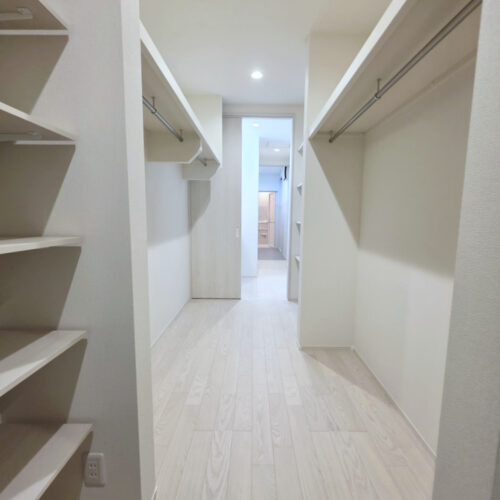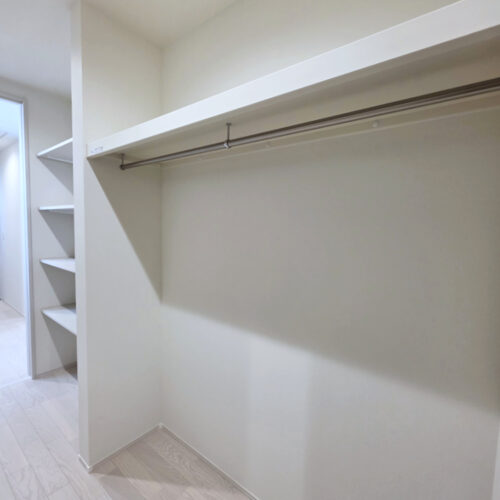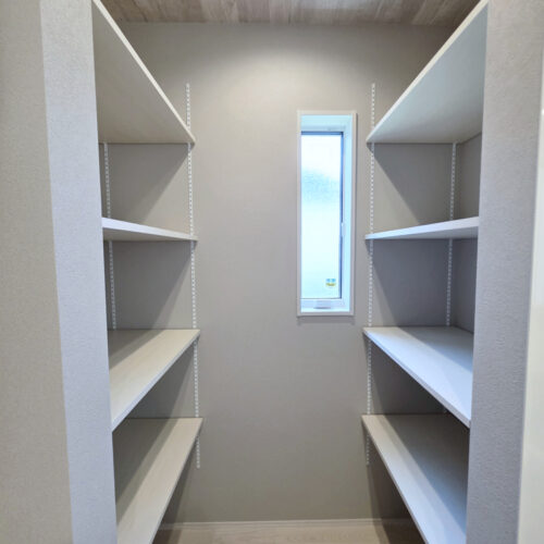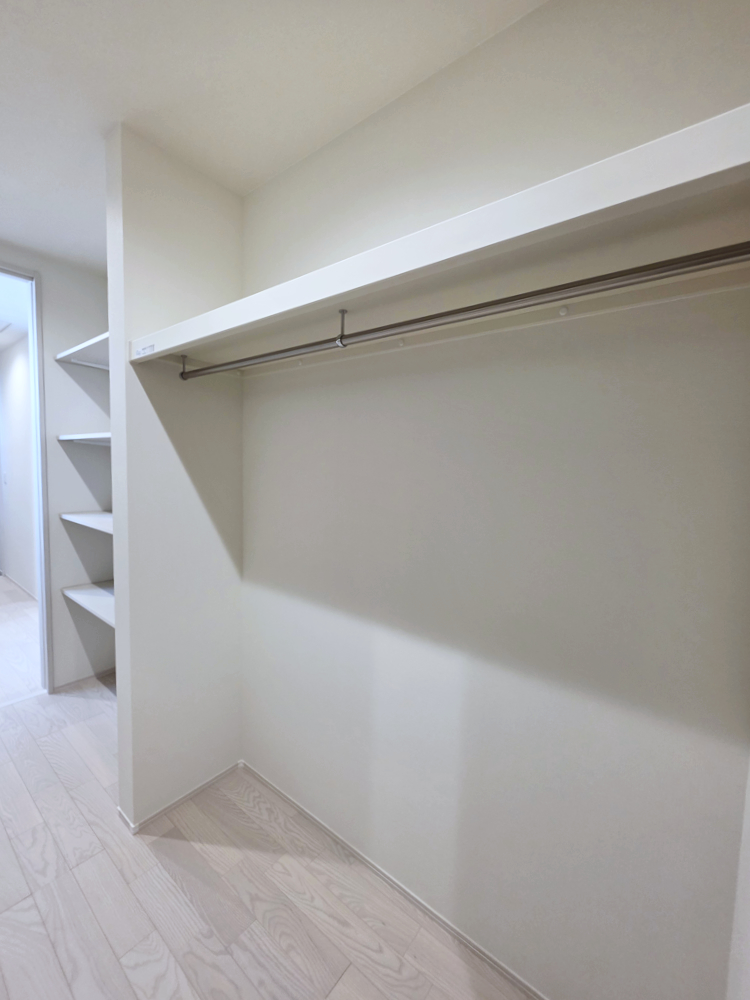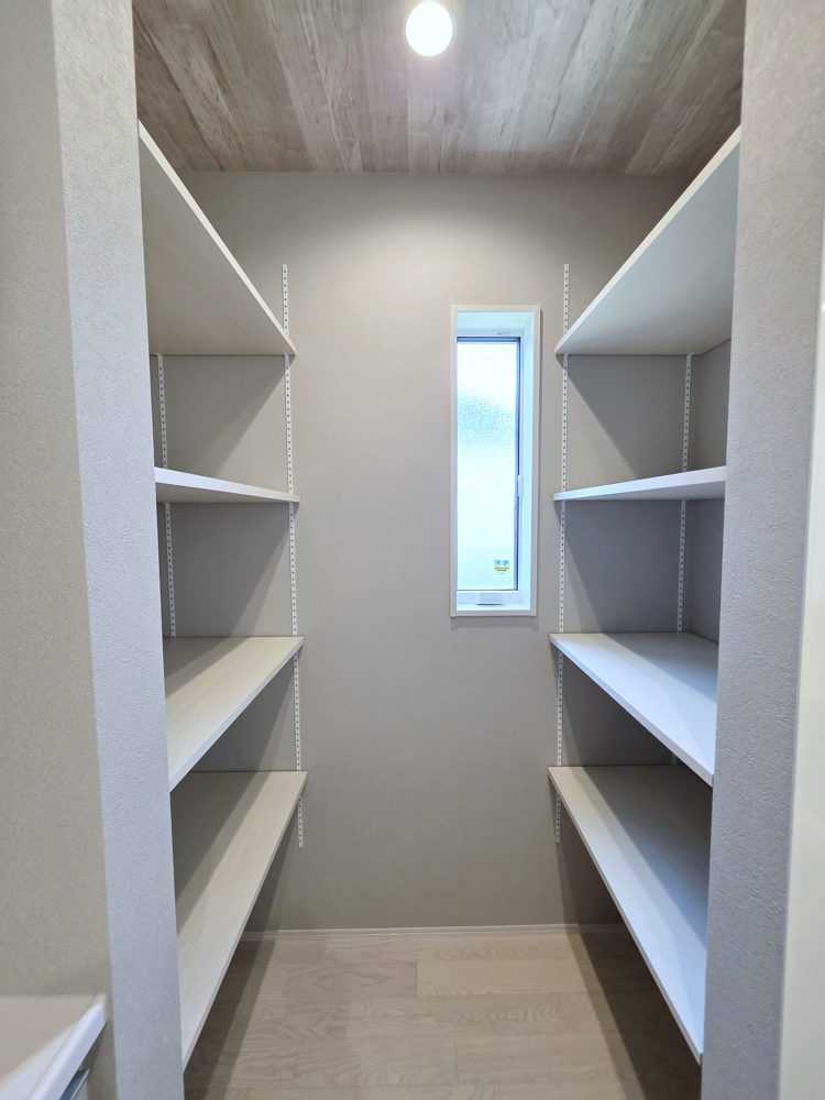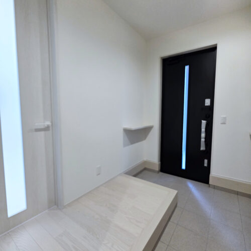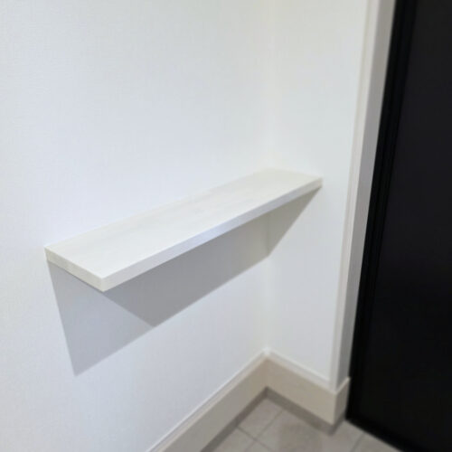 エントランスには、2.6m(3分割)の棚が6段ありたっぷり収納できます。