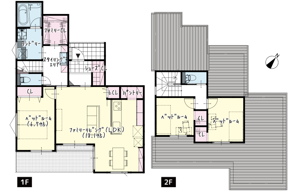 収納力と家事効率にこだわった、共働き世帯にもおすすめの住まいです。1Fは、広々18帖のファミリーリビングを中心に、LCL(リビングクローゼット)、パントリー、大容量のシューズCL(クローク)を完備。水回りもランドリールームとファミリーCLが直結しており、洗濯・乾燥・収納がワンフロアで完結するストレスフリーな動線を実現しました。