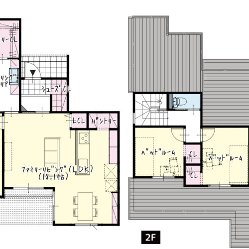 収納力と家事効率にこだわった、共働き世帯にもおすすめの住まいです。1Fは、広々18帖のファミリーリビングを中心に、LCL(リビングクローゼット)、パントリー、大容量のシューズCL(クローク)を完備。水回りもランドリールームとファミリーCLが直結しており、洗濯・乾燥・収納がワンフロアで完結するストレスフリーな動線を実現しました。