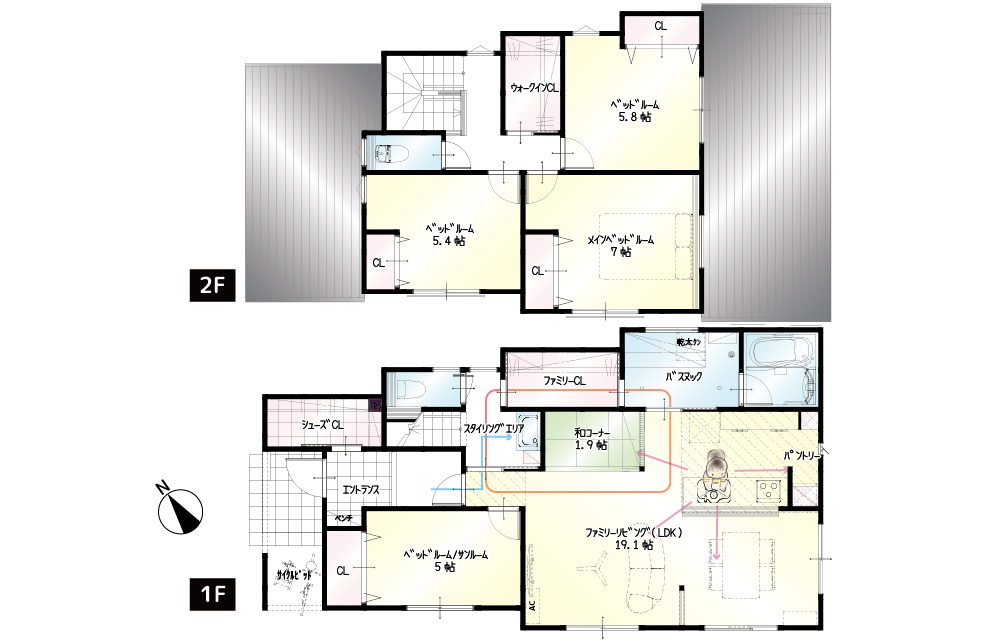 【乾太くん】家事効率を考えて配置したストレスフリーな4LDKの住まい。帰宅後にすぐに手洗いができる位置に脱衣室から独立した洗面化粧台をエントランス近くに配置しました。