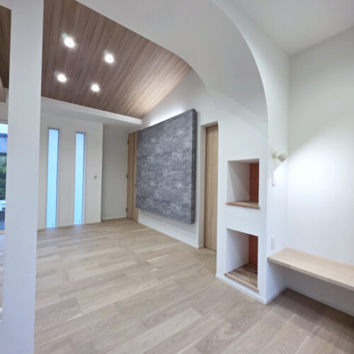 リビング前には、車を置いても十分な広さが取れる前庭があり、屋内~屋外の繋がりを生かした豊かな空間を演出。