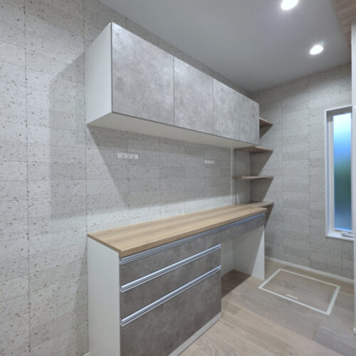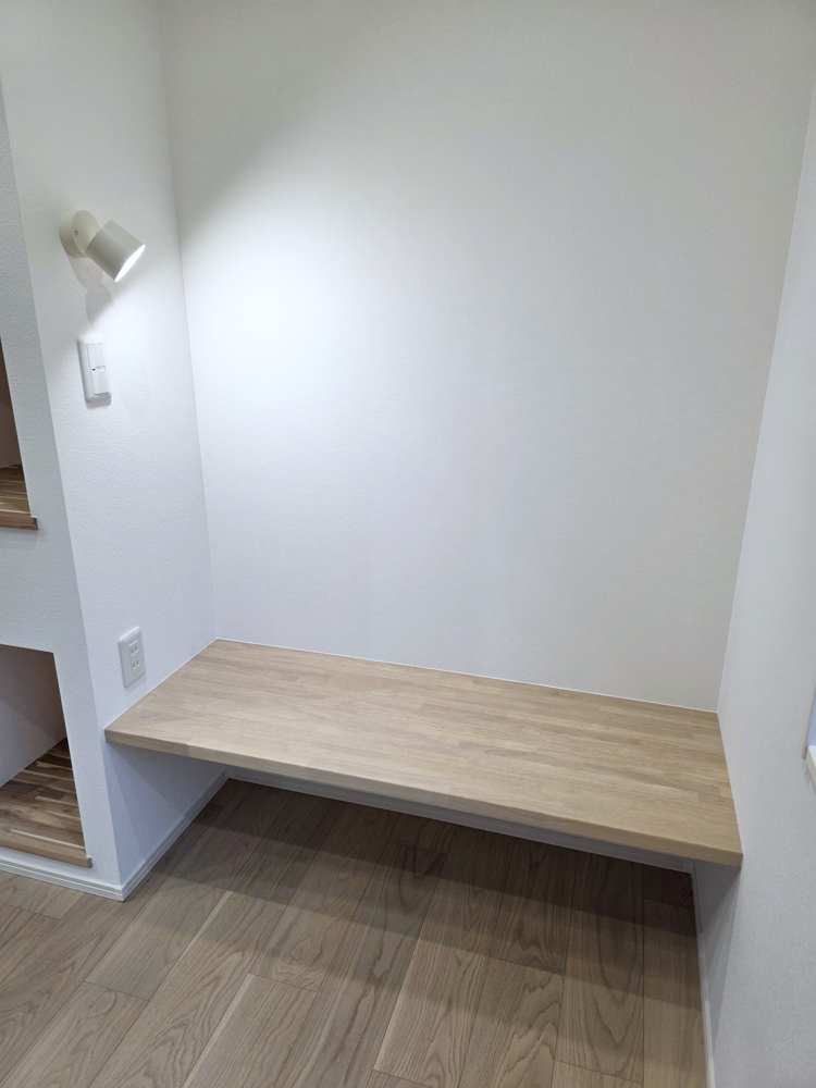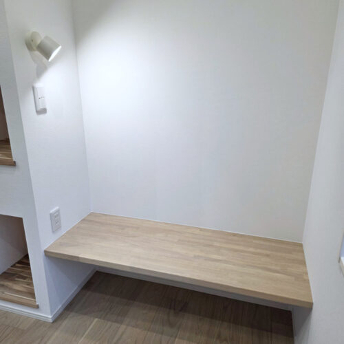 カスタヌック西側に机にもなるベンチを配置しました。ベンチ下に収納BOXをしまったり、スポットライトの下で読書も楽しめます。
