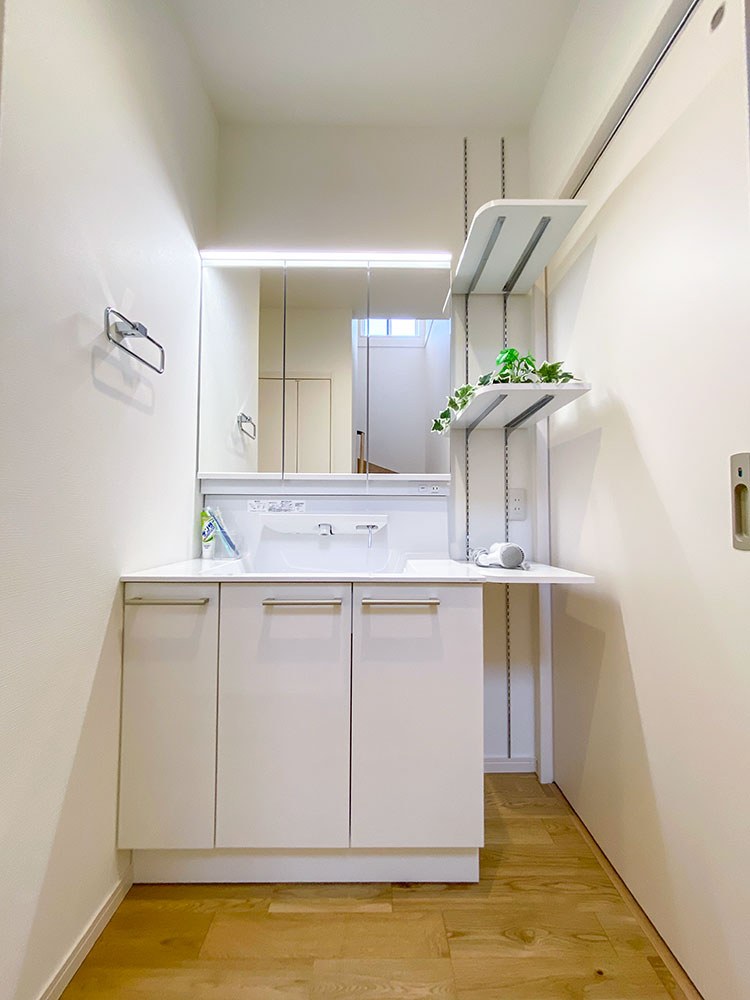 ランドリーで家事ができるようにカウンターを設置。広さも3帖とゆとりを持たせた家事ラクを意識したお家になります。1階にサンルームが付いているので家事が1階で完結します!