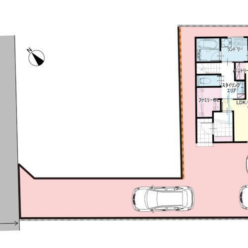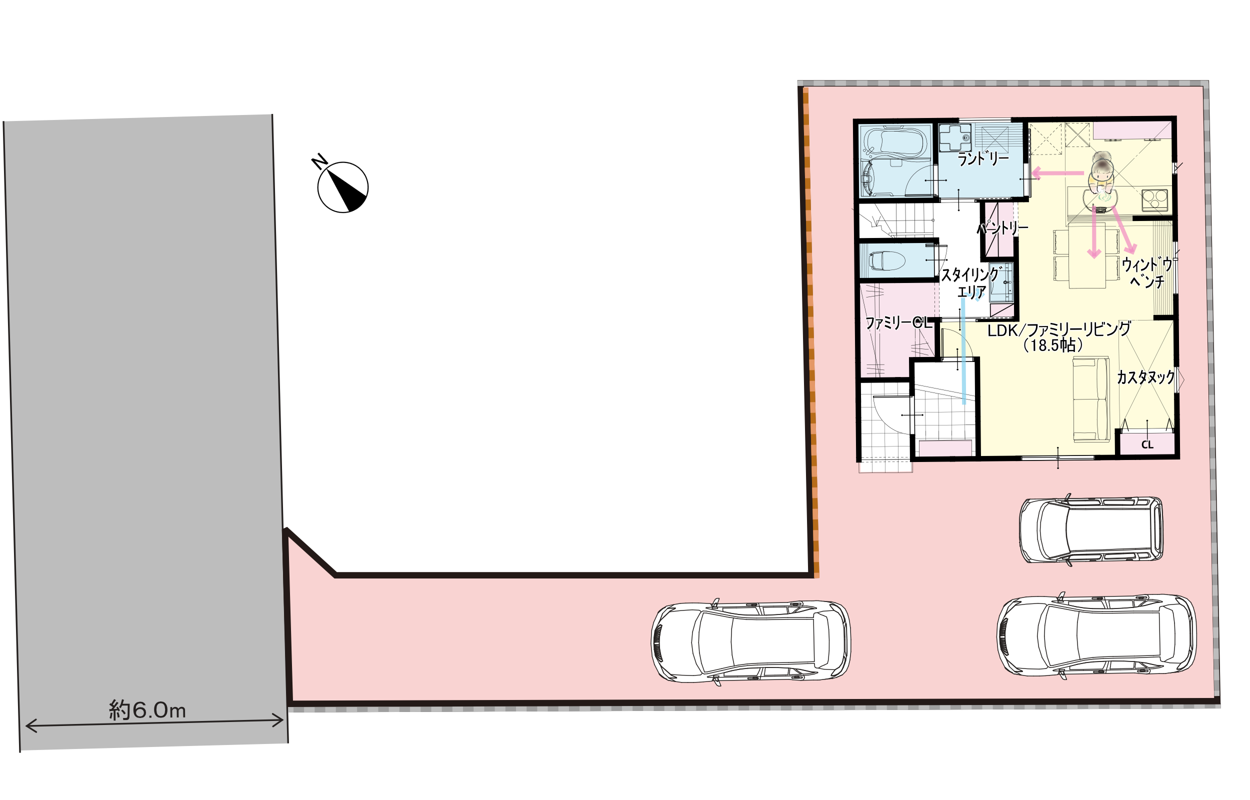 ファミリークローゼット: 玄関から入ってすぐにファミリーCLがあるため、帰宅してすぐに着替え、そのまま洗面へ向かう「ウイルス対策・泥汚れ対策」が完璧に整っています。