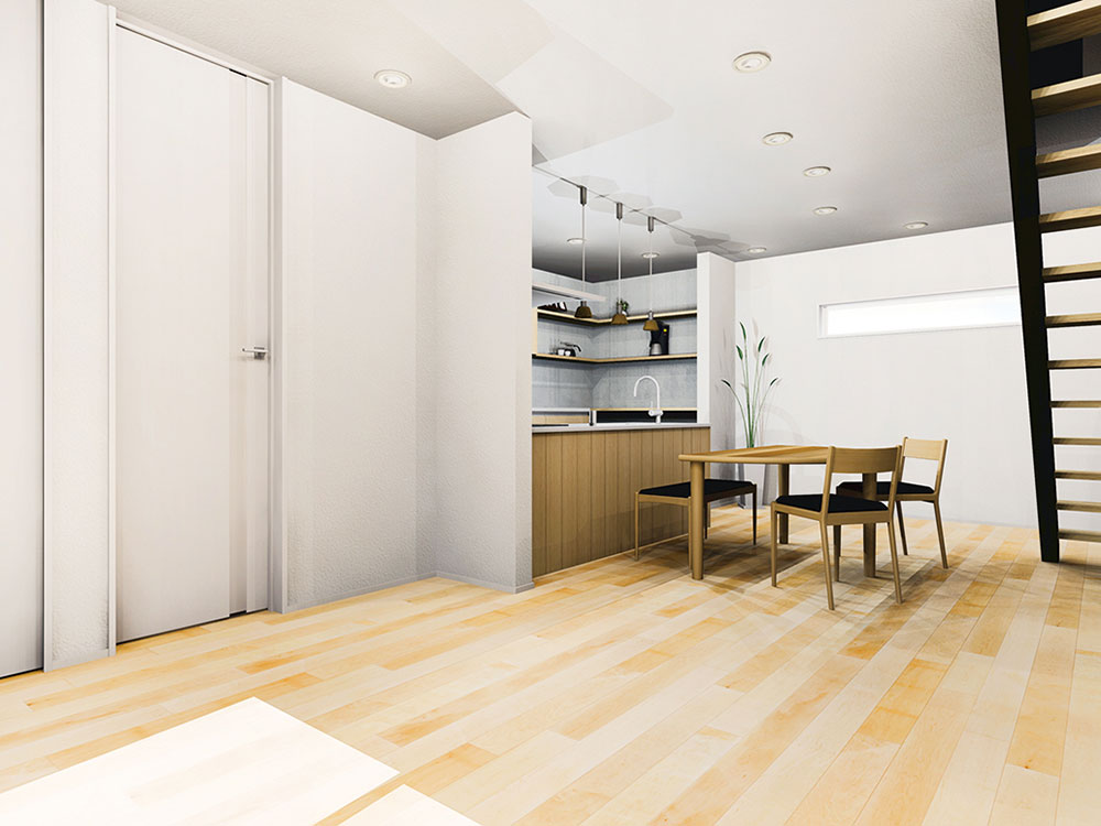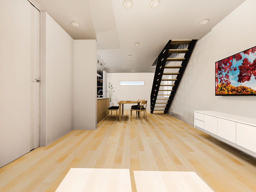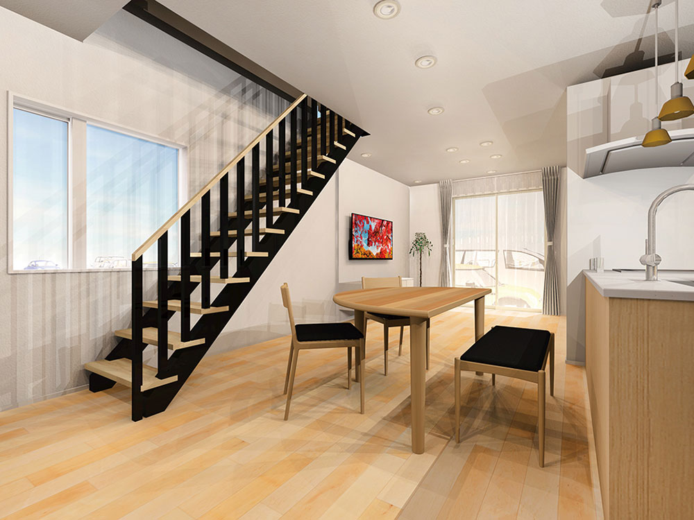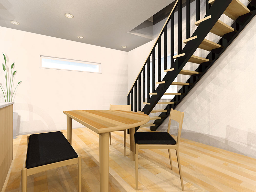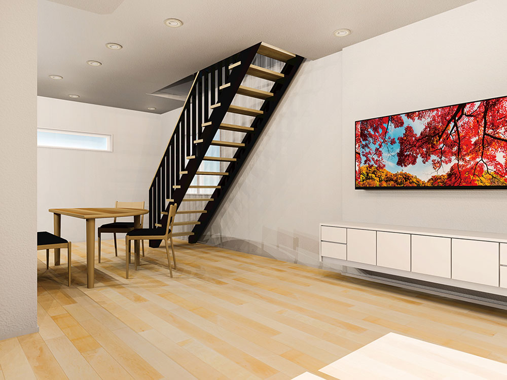 壁の仕切りのないワイドLDKや土間テラスなどにおすすめの階段を採用。