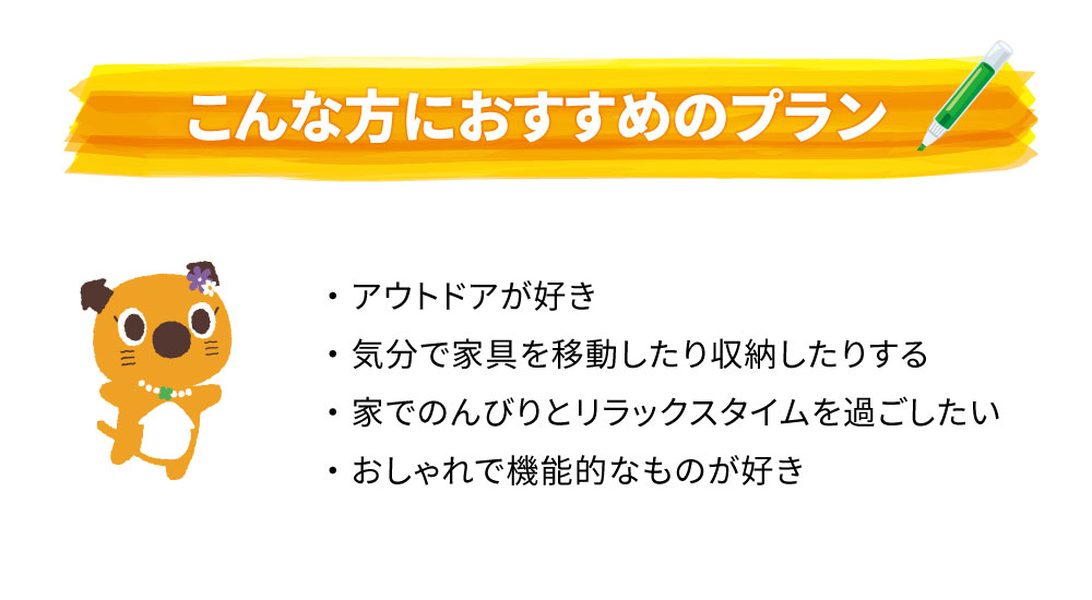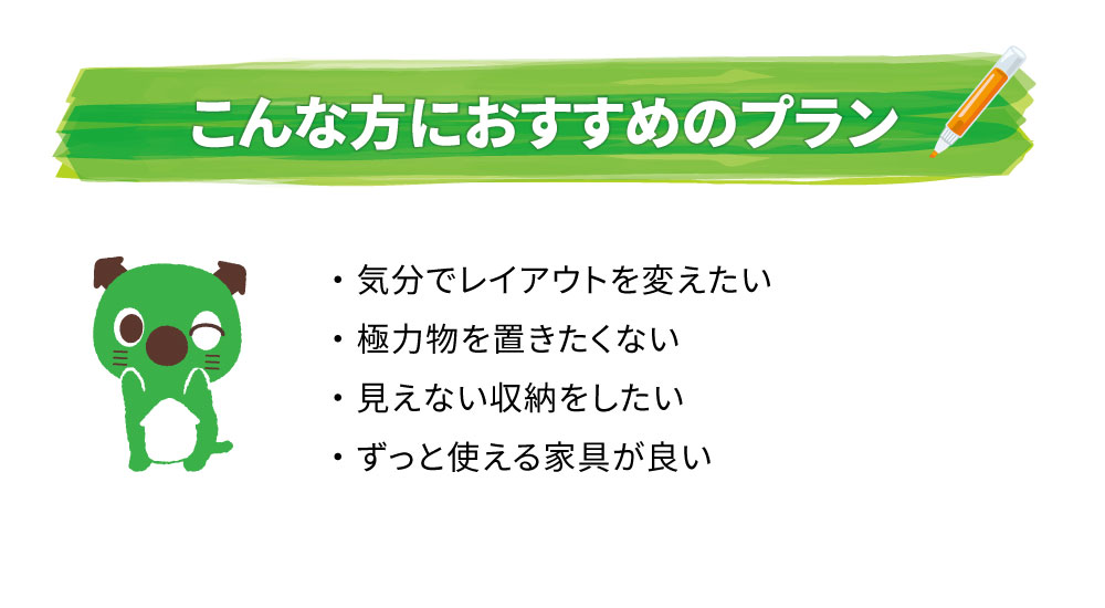 気分や模様替えに対応できる家具を揃えました。スタイリッシュなだけではなく、自由度が高く機能性も兼ね備えています。家の中で気分に合わせて色々とカスタマイズしたい方にお勧めのインテリアプランです。