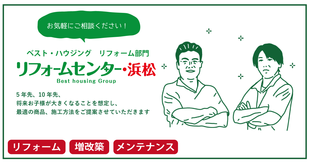 「リフォームセンター・浜松」は、「株式会社ベスト・ハウジング」のグループ会社で、主にリフォームや増改築、お家のメンテナンスを行っております。