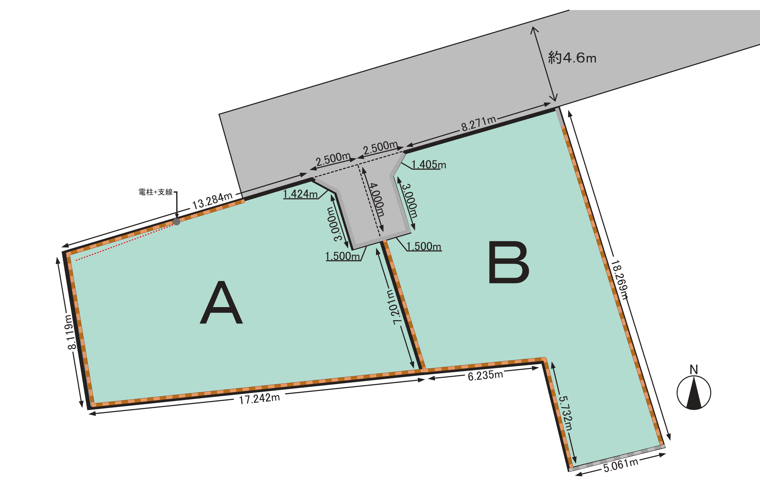 敷地面積45坪以上・全2区画。前面道路は4.6mあり、車の出入りもスムーズ。