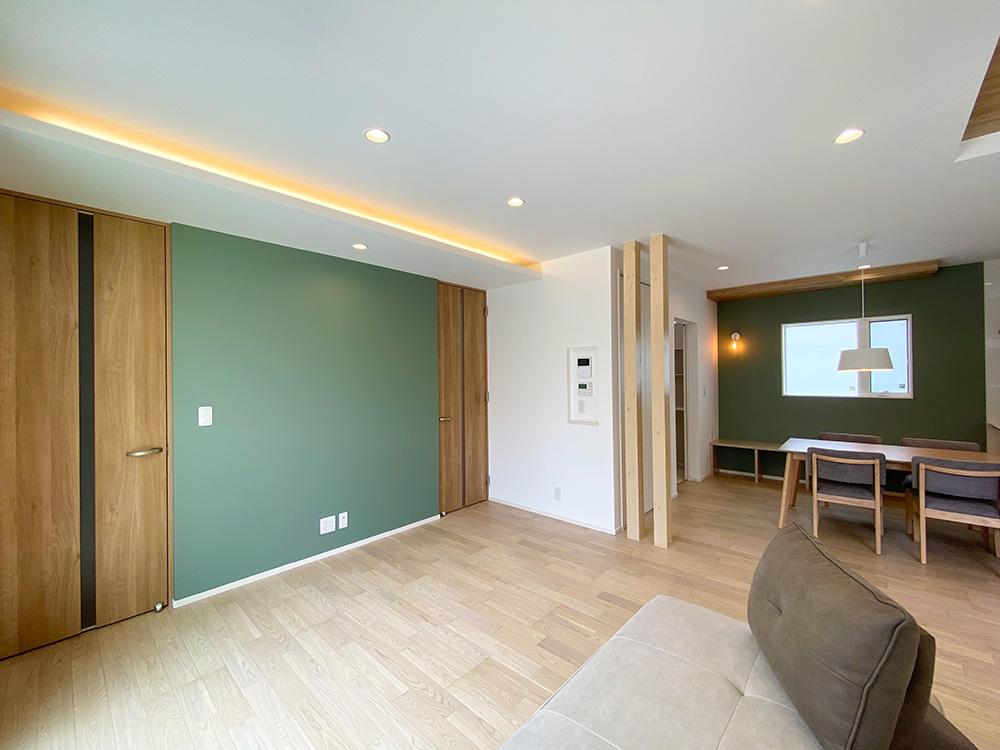 【長期優良住宅】家族で共有できるリラックススペース、ウィンドウベンチがある家!LDK21帖以上のひろびろとしたLDK!玄関からの動線は2way動線を確保しました。手洗い動線もあります。