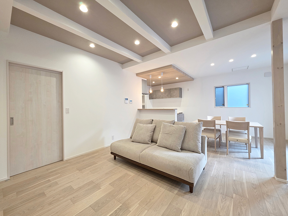 リビング上部には折上天井・梁見を計画し、デザイン性を持たせました。南面の光をなるべく取り入れ開放感のあるリビングスペースとなっております。