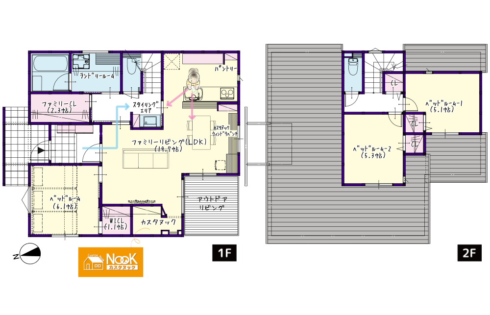 開放的でありながらもゾーニングしたLDKには、デッキなどをつければさらに大空間の家族の集いの場になります。
