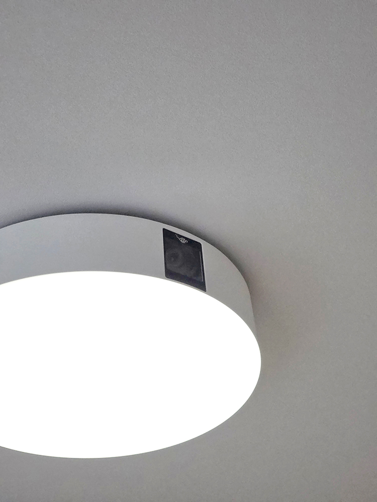 場所を取らないシアターシステム: 天井にはプロジェクター一体型の照明を設置。配線が露出せず、場所も取らないため、寝室のインテリアを損なうことなく大迫力の映像を楽しめます。
