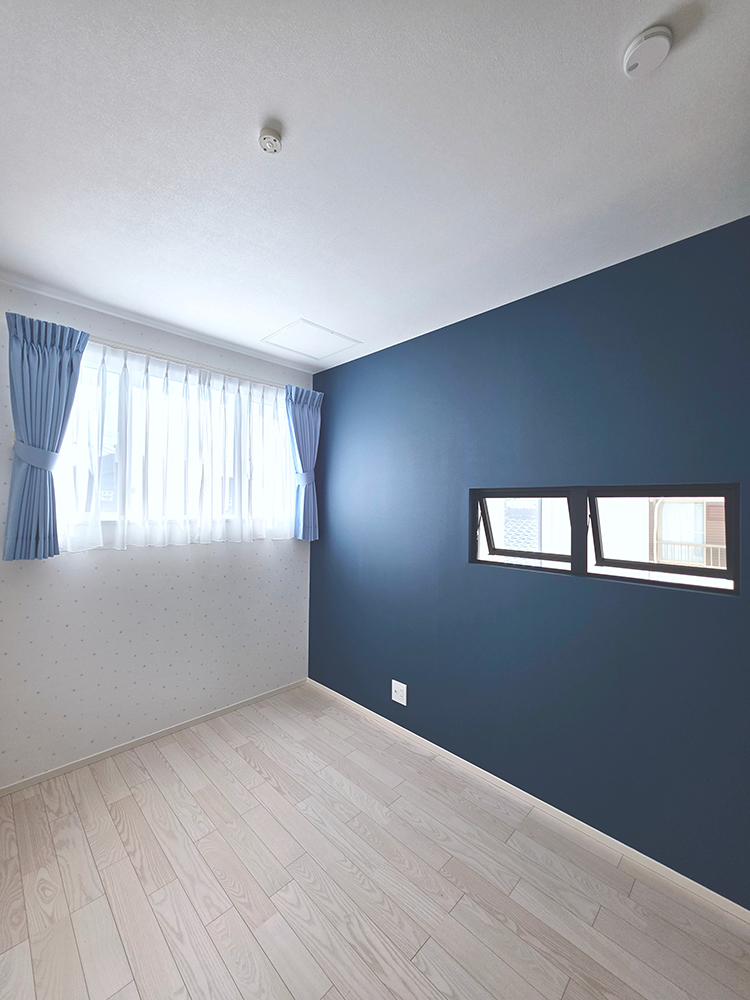 After: 目の覚めるようなディープブルーのアクセントクロスが、空間に深みと知性を与えます。