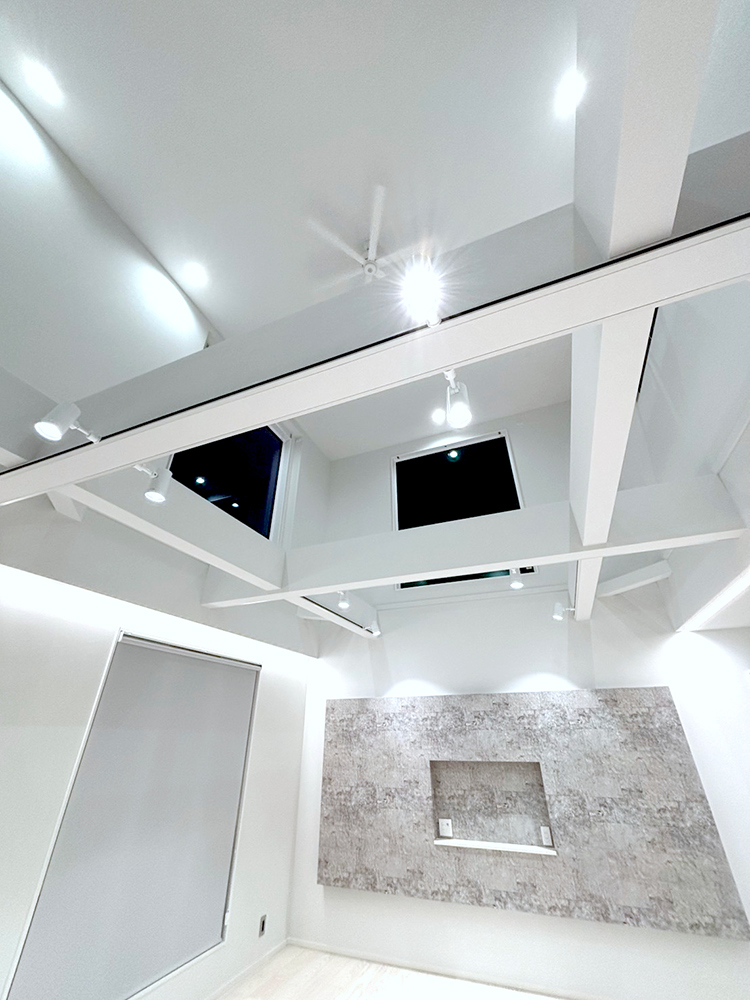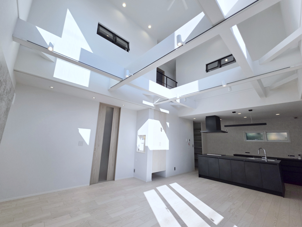 空まで続いているかのような圧倒的な大空間。視線が自然と上へ向かう大きな吹き抜けが、実際の畳数以上の広がりを感じさせます。