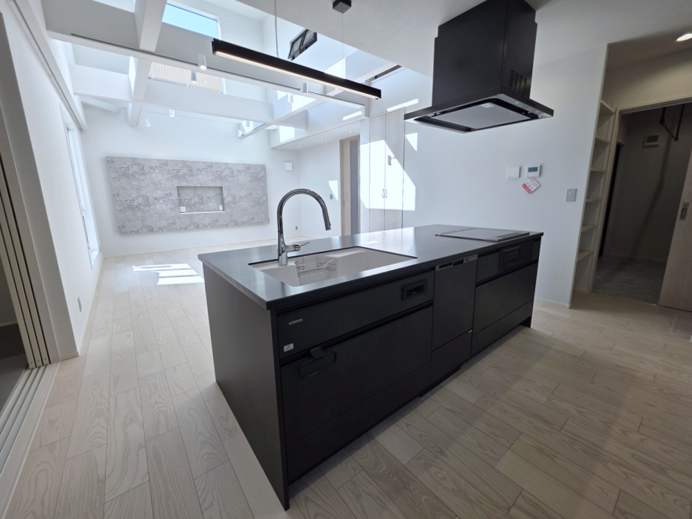 吹き抜け×アイランドキッチン: ホワイトを基調とした明るい空間をキリッと引き締めるのは、ダークグレーのキッチンと、空間にリズムを生み出す現し(あらわし)の梁。