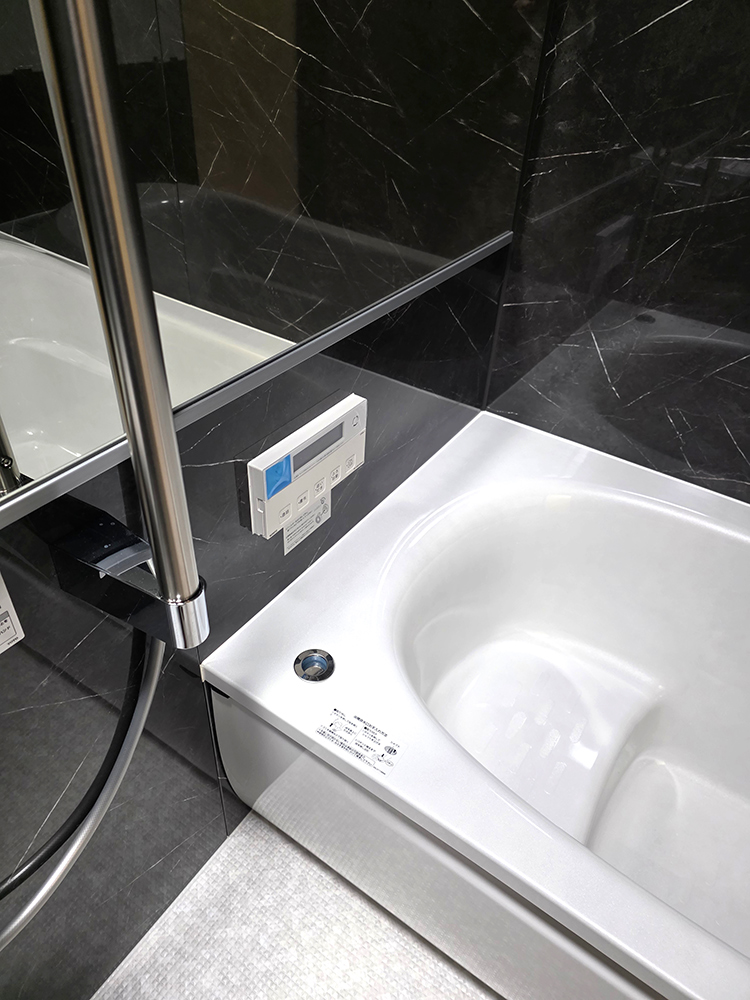 ブラックマーブルの壁面:と清潔感あふれるホワイト浴槽