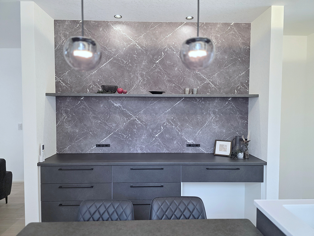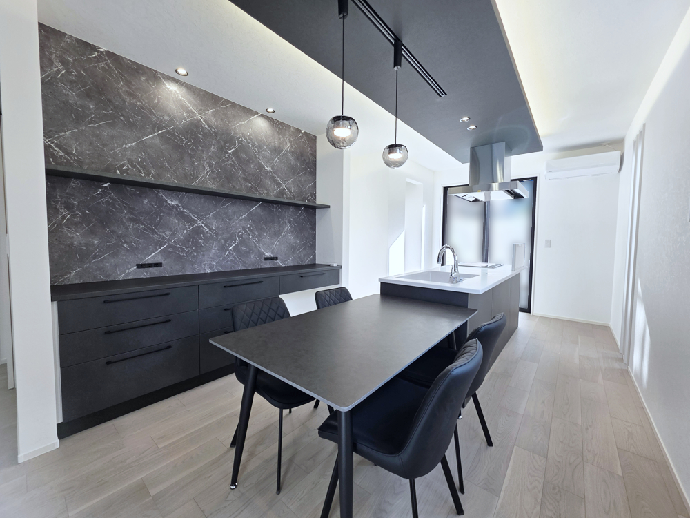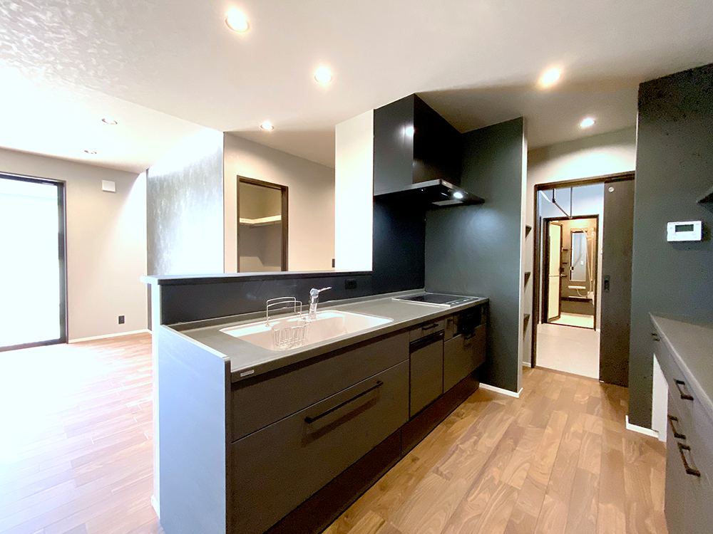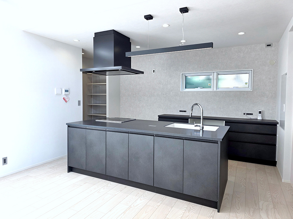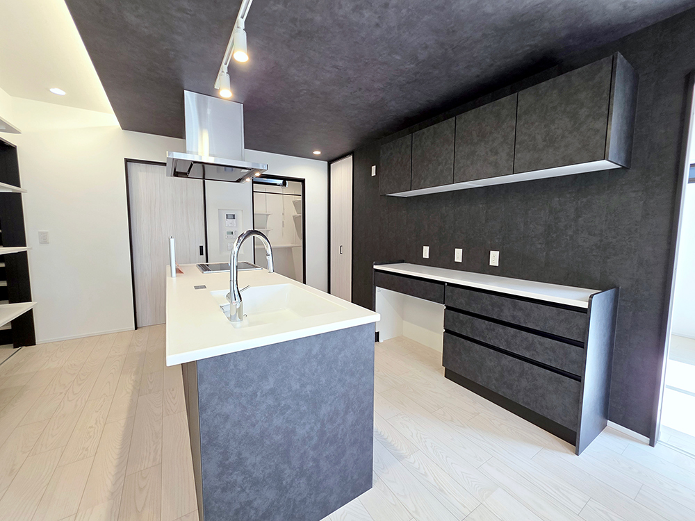 リビングの主役となるキッチンは、意匠性はもちろん、日々の使い勝手にも一切の妥協がありません。建売を検討中の方でも、この『天板の質感』や『照明の合わせ方』をマネするだけで、内装のオシャレ度は格段にアップします♪