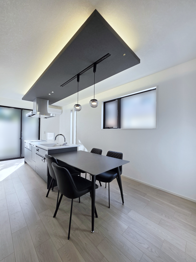 シックにまとまったブラックインテリアの中でペンダントライトはまさに”空間のジュエリー”のような存在。 黒の背景に浮かび上がる印象的なシルエットが、単調になりがちな空間に華やかな印象を生み出します。あえてお気に入りのデザインを一点置くことで、視線が集まるアイコニックな場所に。 こだわりの灯りが質感を際立たせ、LDK全体にさらなる彩りを与えてくれます。