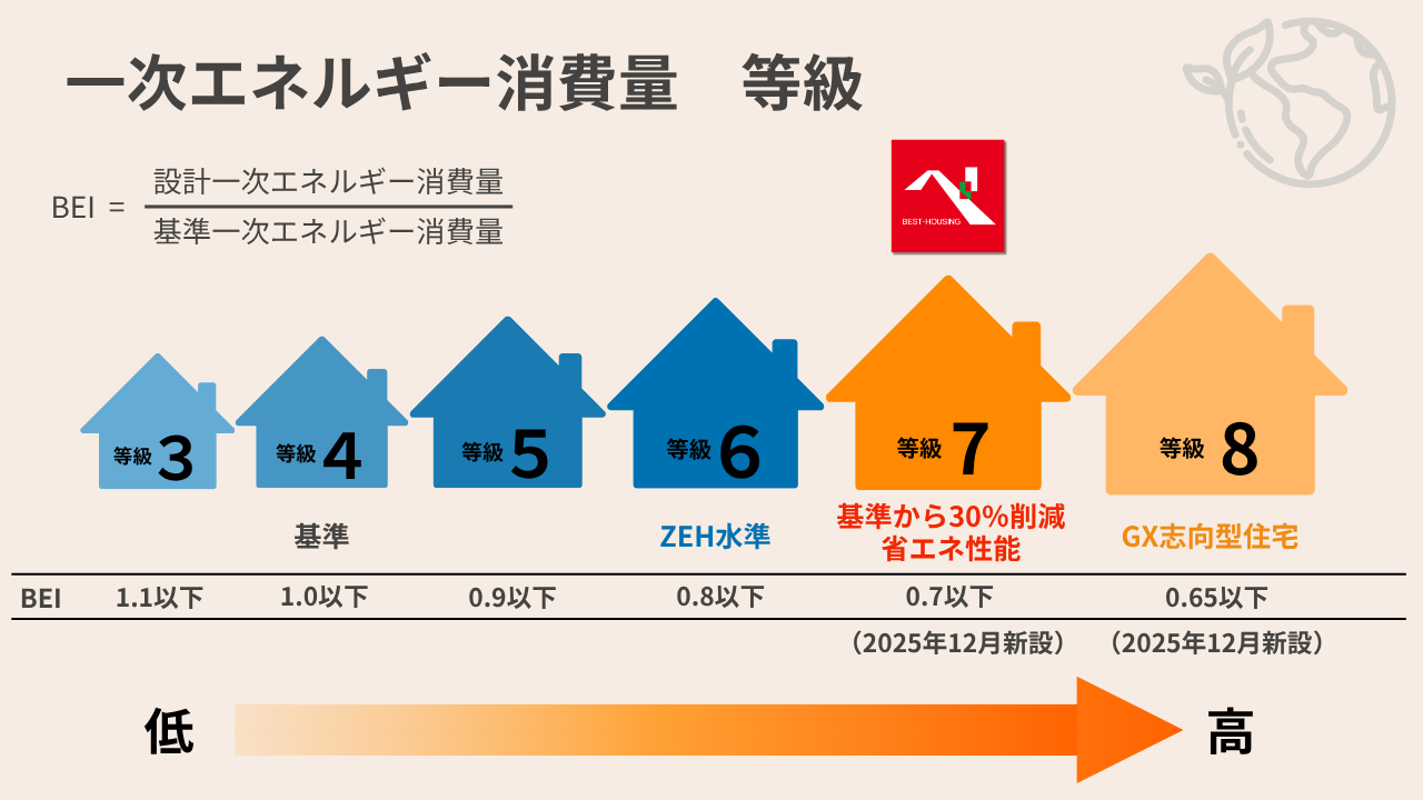 一次エネルギー消費量等級:1年間に消費するエネルギー量を等級(数字)で示す指標