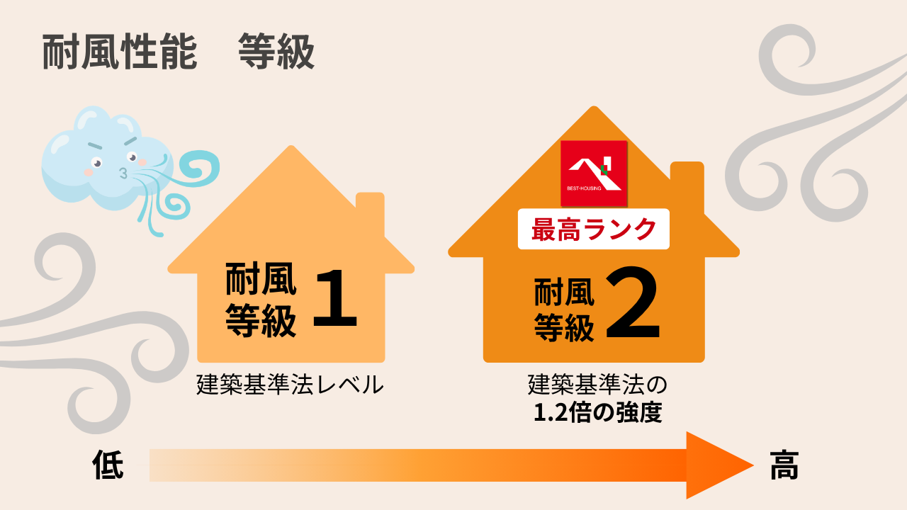 耐風等級1:50年に一度程度発生する暴風に対して建物が損傷しない/500年に一度程度発生する暴風に対して建物が倒壊・崩壊しない程度の強さ