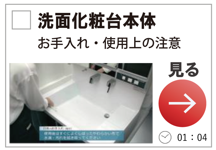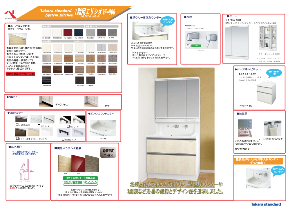 Takarastandard(タカラスタンダード) エリシオの洗面化粧台をお使いで困っていることがありましたら以下をご参照ください。画像をクリックしていただくと詳細がご覧いただけます。 Takarastandard エリシオお手入れ方法・使い方 Takarastandard エリシオ 設備情報 Takarastandardタカラスタンダード洗面化粧台エリシオお手入れ方法使い方設備情報