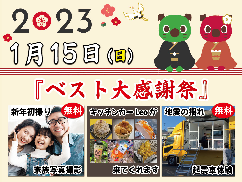 住まい相談はもちろん、家族写真の初撮りやキッチンカーで食事ができるベスト大感謝祭開催!起震車地震体験も♪