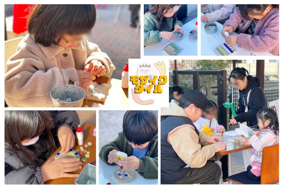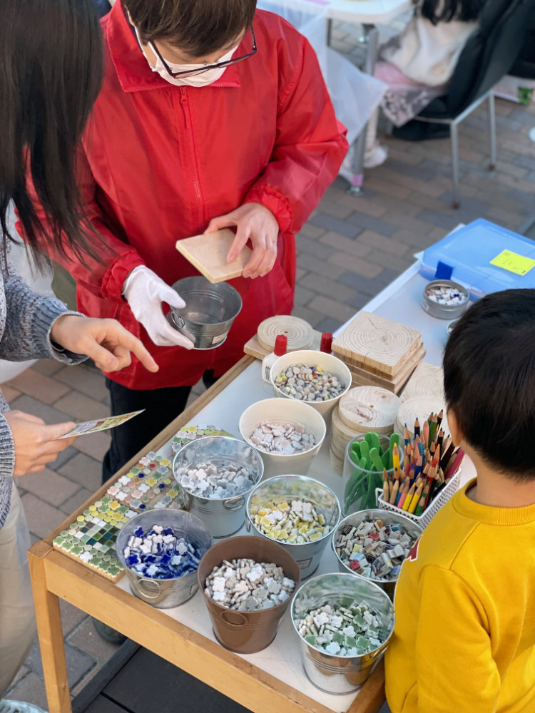 廃材を使った木の板に、色とりどりのタイルを自由に貼っていきました。個性豊かなたくさんのコースターになりました♪