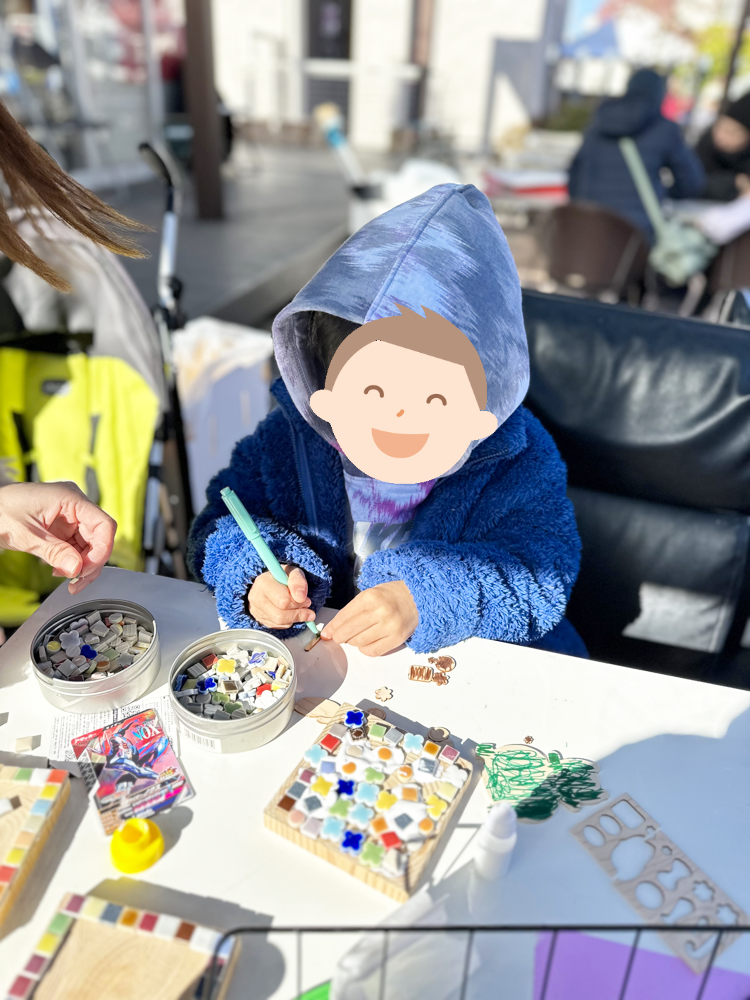 廃材を使った木の板に、色とりどりのタイルを自由に貼っていきました。個性豊かなたくさんのコースターになりました♪